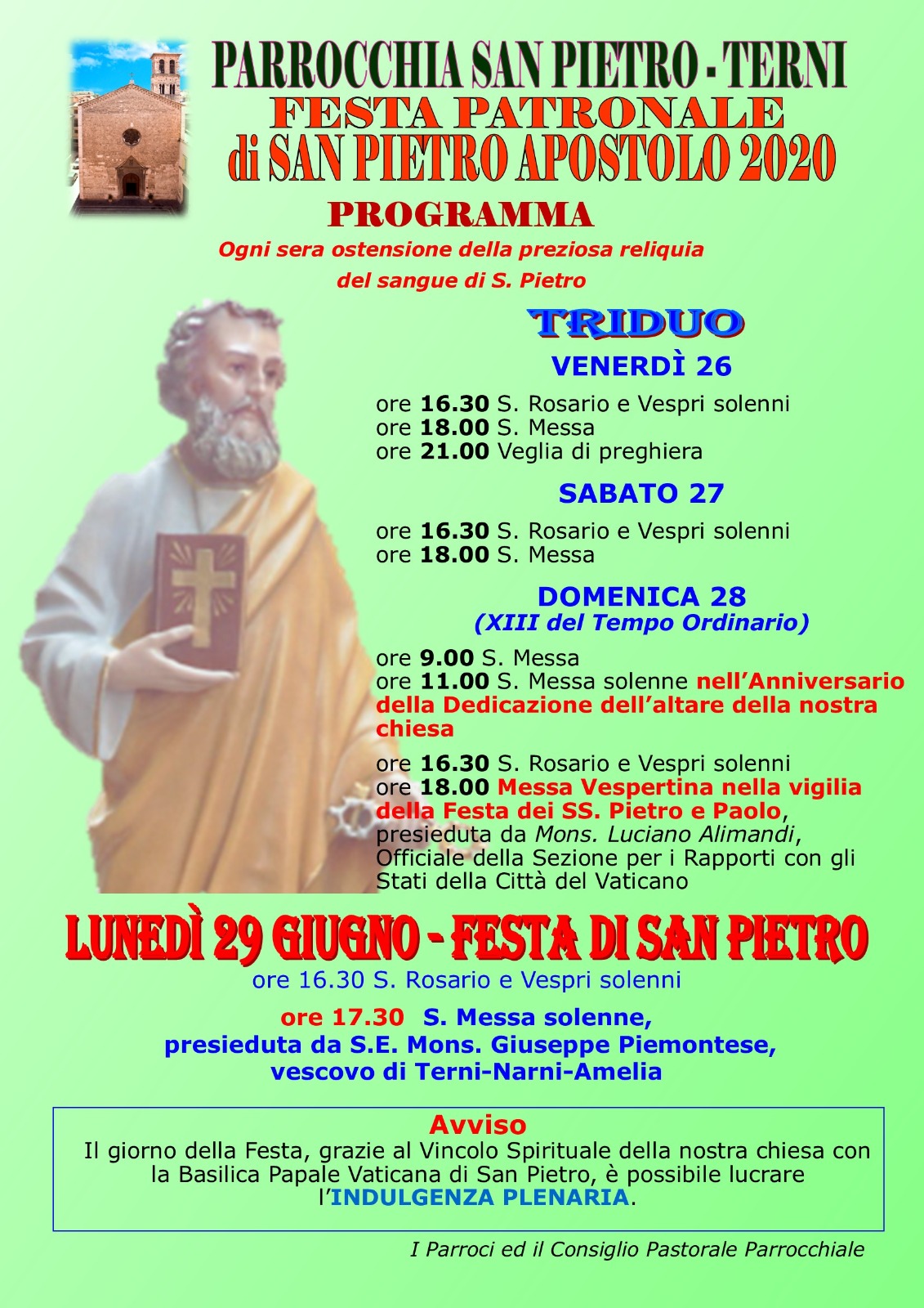 La parrocchia di San Pietro a Terni celebra la festa del patrono, dal 26 al 29 giugno, con diverse cerimonie e con l’ostensione della preziosa reliquia del sangue di S.Pietro