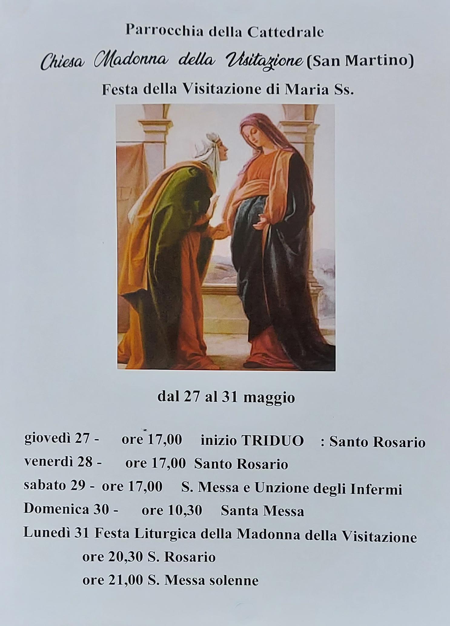 Lunedì 31 maggio, festa liturgica della Madonna della Visitazione, ore 20.30 recita del Rosario e ore 21 Santa Messa