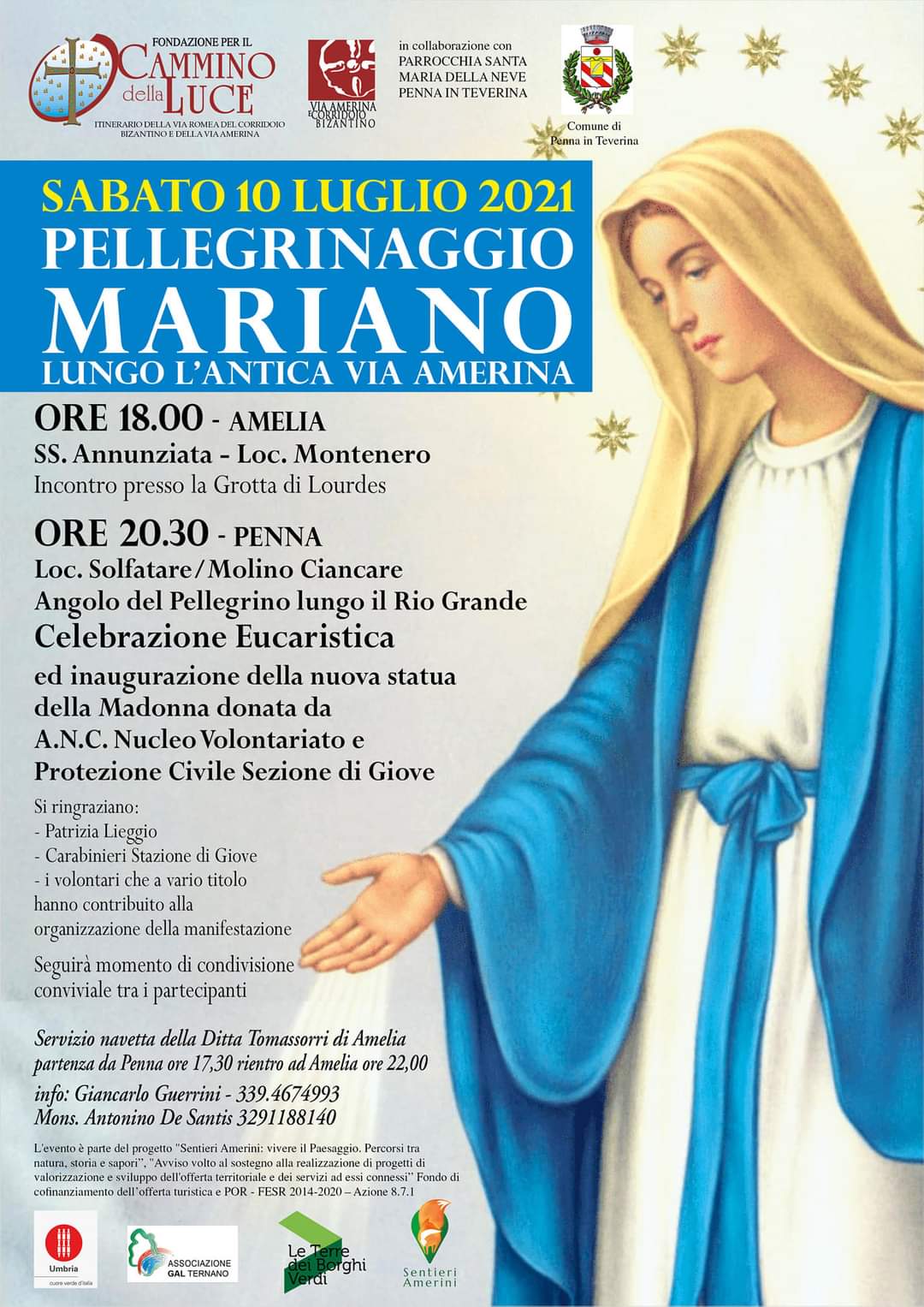 Sabato 10 luglio alle ore 18 ritrovo alla “Grotta di Lourdes”, presso l’ Annunziata di Amelia, momento di preghiera e partenza; ore 20.30 arrivo nella suggestiva località Solfatare di Penna in Teverina, angolo del pellegrino lungo il Rio grande per la celebrazione Eucaristica e inaugurazione della nuova statua della Madonna donata dal Nucleo volontariato e Protezione civile di Giove.