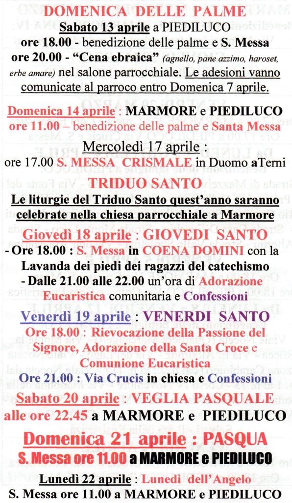 Parrocchia Piediluco e Marmore – celebrazioni della Settimana Santa