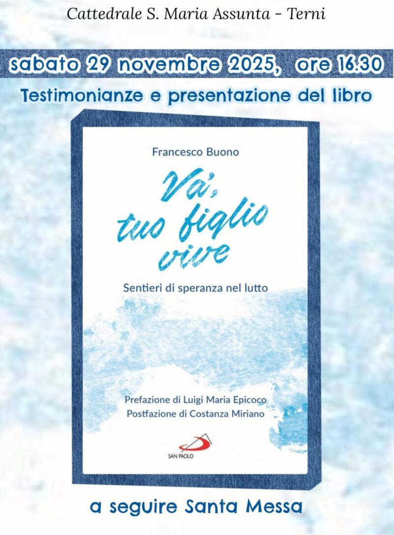Sabato 29 novembre alle ore 16.30 nella Cattedrale di Terni si terrà la presentazione del libro Va’ tuo figlio vive (Ed. S. Paolo, 2025) e le testimonianze di alcuni genitori che racconteranno l’esperienza della perdita di un figlio vissuta nella luce della fede e della speranza in Gesù Cristo, alle quali farà seguito la celebrazione dell’Eucaristia presieduta da don Francesco Buono.