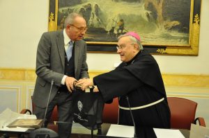 Ha poi ricordato la figura del vescovo di Terni Vincenzo Tizzani, sacerdote attento ai bisogni della gente e soprattutto dei poveri, che è stato il fondatore, agli inizi dell’Ottocento, della cassa di risparmio, quale istituto che potesse dare aiuto alle persone in difficoltà. A lui si devono anche le società di mutuo soccorso per gli operai in città e la lotta all’usura. “Sono qui per ringraziarvi per quello che fate per la città – ha detto padre Piemontese – per la chiesa cattolica e le associazioni. La chiesa è come un canale che riceve e ridona: penso a tutte le attività della Caritas. della San Martino, della San Vincenzo, per l’emergenza freddo, per lenire difficoltà e sofferenze che sono aumentate in maniera esponenziale. Le iniziativa che prendete nei nostri confronti, sentiamo la responsabilità di portarle a compimento coscientemente e nel migliore dei modi. E in questo ricordo anche i progetti per la conservazione e tutela dei beni culturali. Un patrimonio da tramandare agli altri. Rinnovo anche la disponibilità per iniziative comuni. Ed infine l’opera per la formazione e l’educazione dell’Istituto Leonino che è un’opera importante che vorremmo portare avanti per il bene della città.