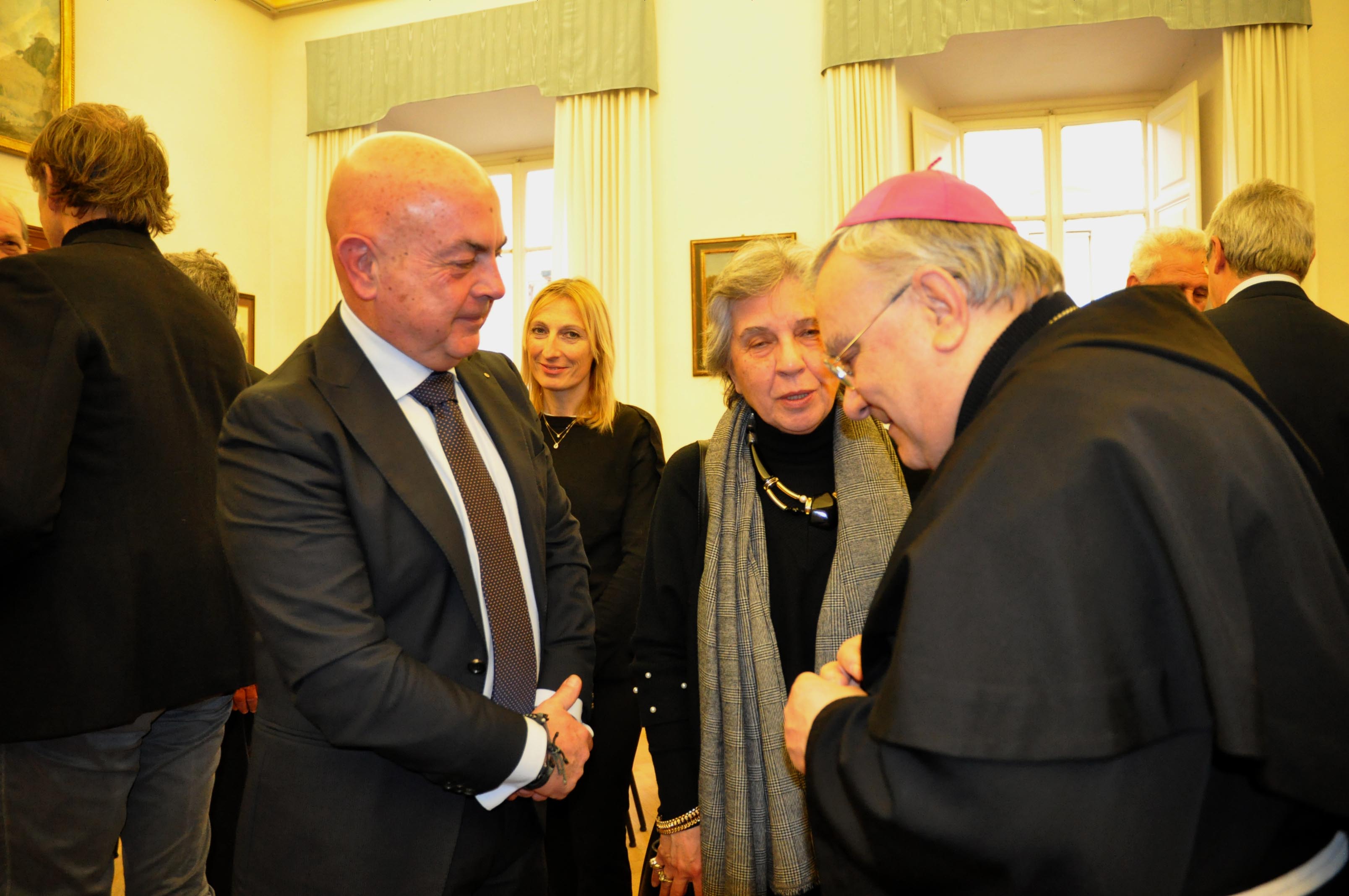 Il vescovo ha quindi donato un quadro con il Cantico delle Creature e il presidente Carlini un volume sulla storia dell’istituzione e della fondazione e cataloghi delle più recenti mostre curate dallo stesso ente.