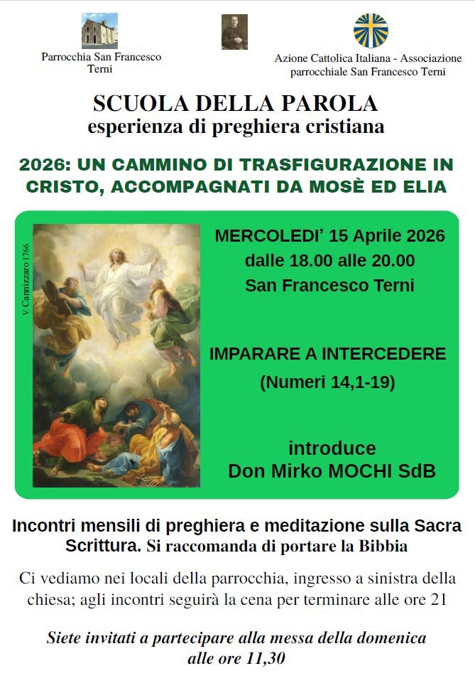 Mercoledì 15 aprile 2026 alle ore 18 presso la Parrocchia di San Francesco – Salesiani, incontro della Scuola della Parola esperienza di vita cristiana, promossa dall’Azione Cattolica Italiana – Associazione Parrocchiale San Francesco – Terni – e dalla Commissione Parrocchiale Evangelizzazione e Catechesi degli Adulti e Famiglia. L’incontro sarà dedicato al tema: “Imparare a intercedere” (Numeri 14, 1-19)” introdurrà il Parroco Don Mirko Mochi.