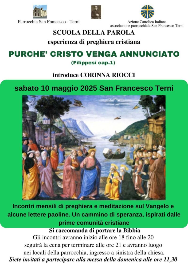 Sabato 10 maggio 2025, presso la Parrocchia di San Francesco – Salesiani, alle ore 18, si terrà l’incontro della Scuola della Parola esperienza di preghiera cristiana, promossa dall’Azione Cattolica associazione parrocchiale San Francesco Terni e dalla commissione parrocchiale Evangelizzazione e Catechesi degli Adulti e Famiglia. Tema dell’incontro sarà: “Purchè Cristo venga annunciato” (Filippesi cap.1)” introdurrà Corinna Riocci.