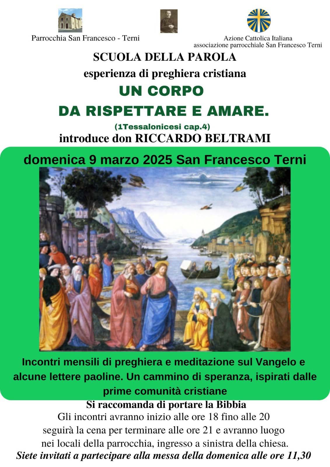 Domenica 9 marzo 2025, presso la Parrocchia di San Francesco in Terni, alle ore 18, si terrà l’incontro della Scuola della Parola esperienza di preghiera cristiana, promossa dall’Azione Cattolica associazione parrocchiale San Francesco Terni e dalla commissione parrocchiale Evangelizzazione e Catechesi degli Adulti e Famiglia. Tema dell’incontro: “Un corpo da rispettare e amare” (1 Tessalonicesi cap.4) introdurrà don Riccardo Beltrami.