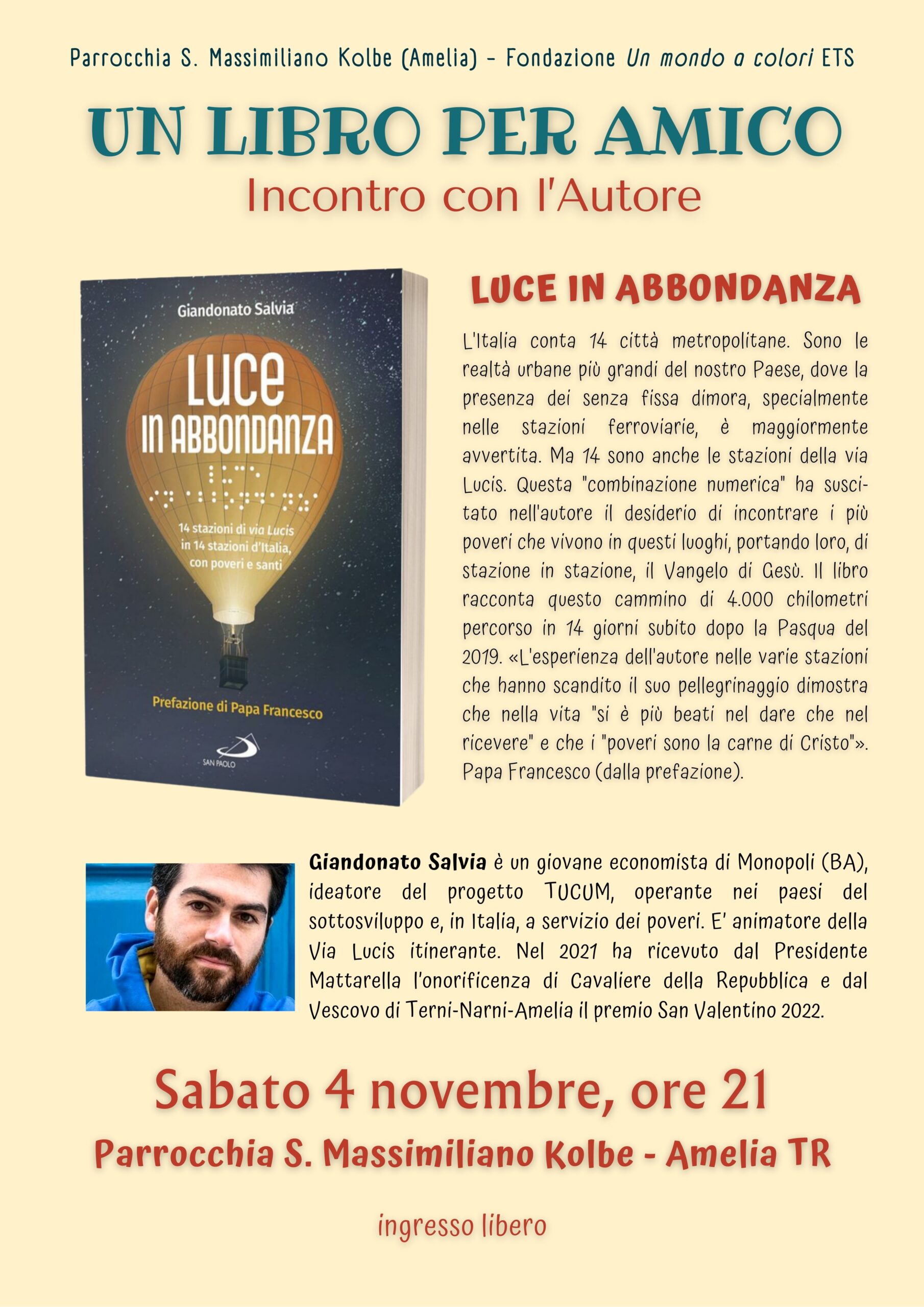 Il primo appuntamento sabato 4 novembre sarà dedicato alla presentazione di libro “Luce in abbondanza” di Giandonato Salvia, edizioni San Paolo, un’approfondimento delle 14 stazioni di via Lucis in 14 stazioni d’Italia, con poveri e santi.