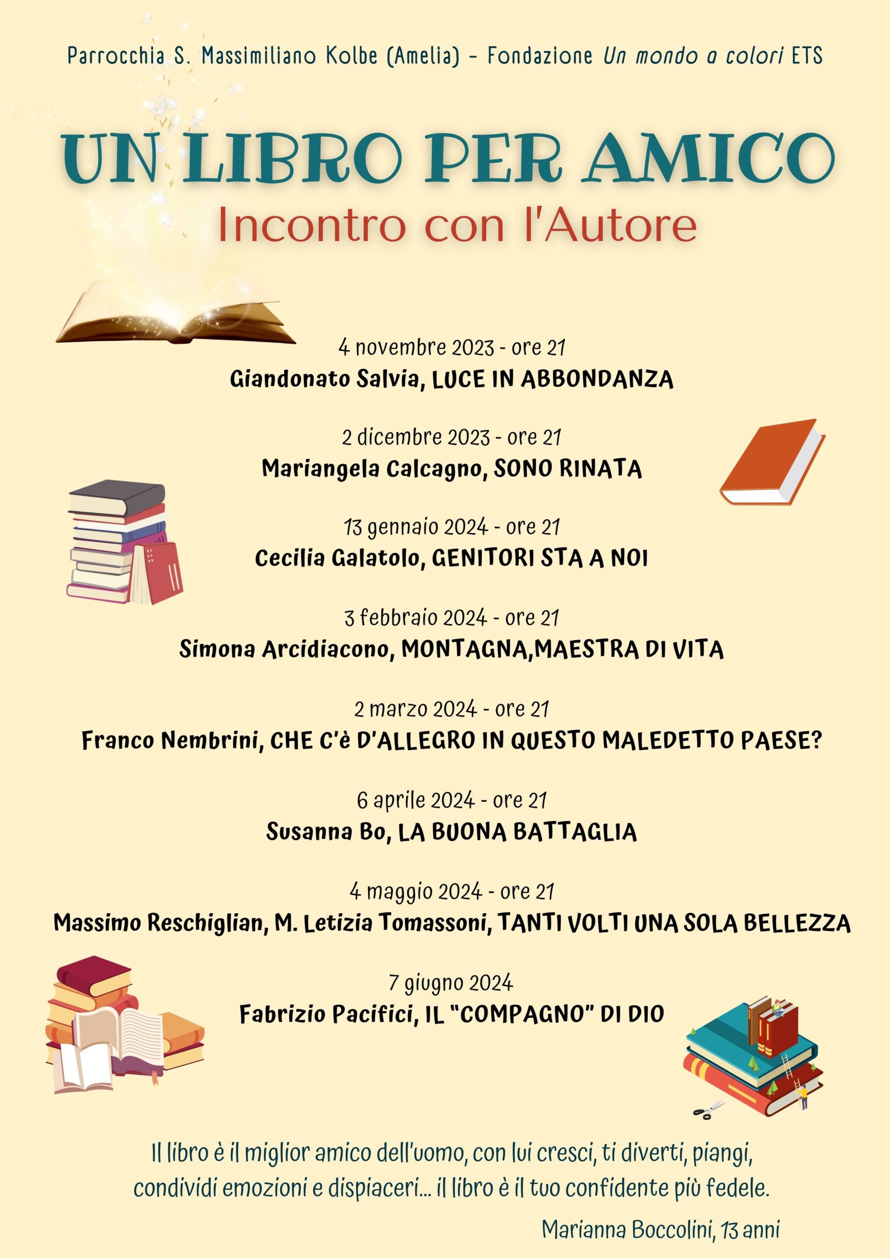 La Parrocchia di S. Massimiliano di Amelia, in collaborazione con la Fondazione Un mondo a colori – ETS, organizza nei primi sabati di ogni mese, alle ore 21, un incontro con l’autore di un testo che riporta testimonianze attuali di vita cristiana e di evangelizzazione.