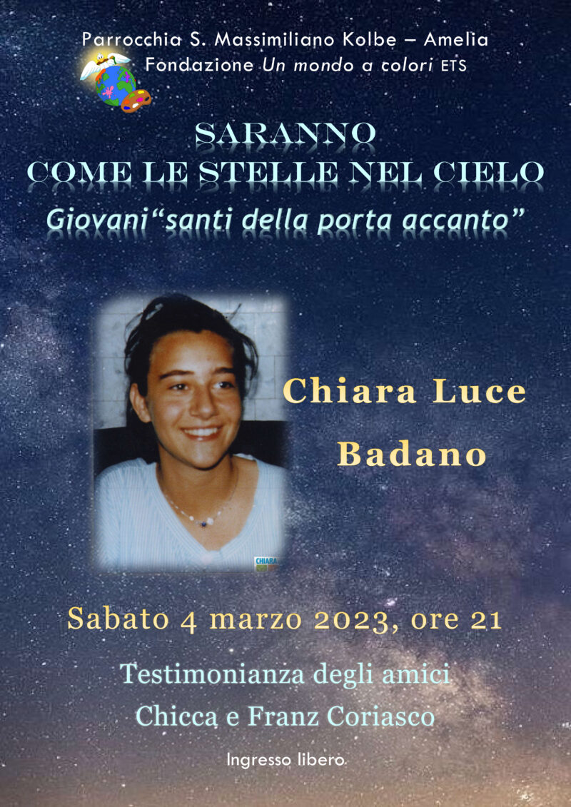Sabato 4 marzo 2023 alle ore 21.00, presso la parrocchia di San Massimiliano Kolbe, in Amelia, ci sarà la testimonianza su Chiara Luce Badano. Saranno presenti Chicca e Franz Coriasco, amici di Chiara Luce.