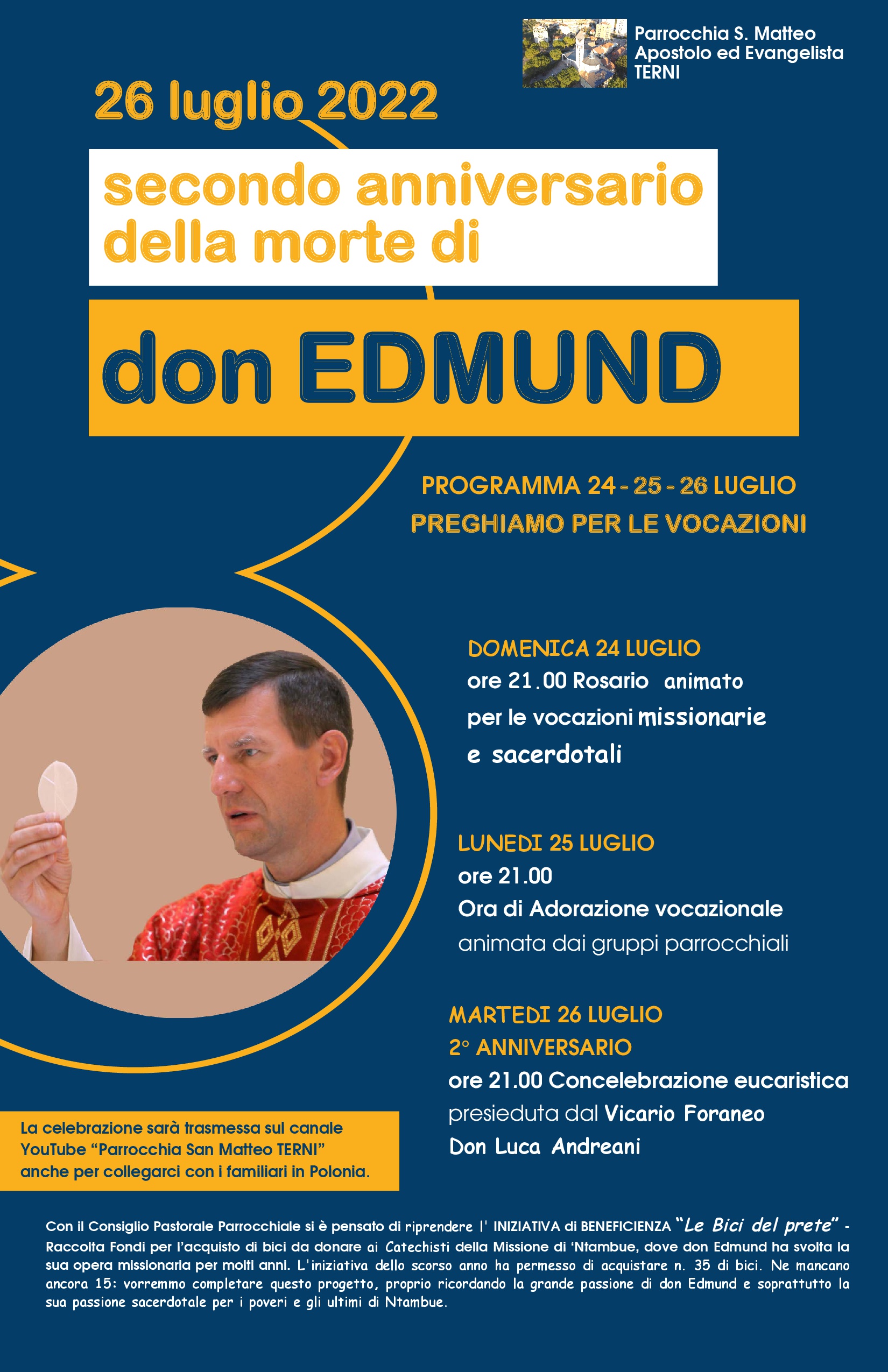 La celebrazione sarà trasmessa sul canale YouTube “Parrocchia San Matteo Terni” anche per collegarci con i familiari di don Edmund in Polonia.