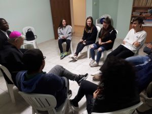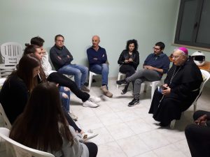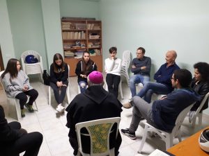 In occasione della visita pastorale il vescovo ha incontrato il gruppo giovanissimi di Azione Cattolica composto da una decina di ragazzi dai 16 ai 19 anni. Al vescovo sono state illustrate le attività formative e di animazione proposte dal gruppo tra cui i campi estivi, le attività di aiuto compiti, l’animazione della Via Crucis, l’attività di informazione e conoscenza svolta in occasione delle ultime elezioni amministrative con incontri con i diversi candidati ed anche di conoscenza della città e delle sue problematiche, dell’impegno sociale e civile nel quartiere.