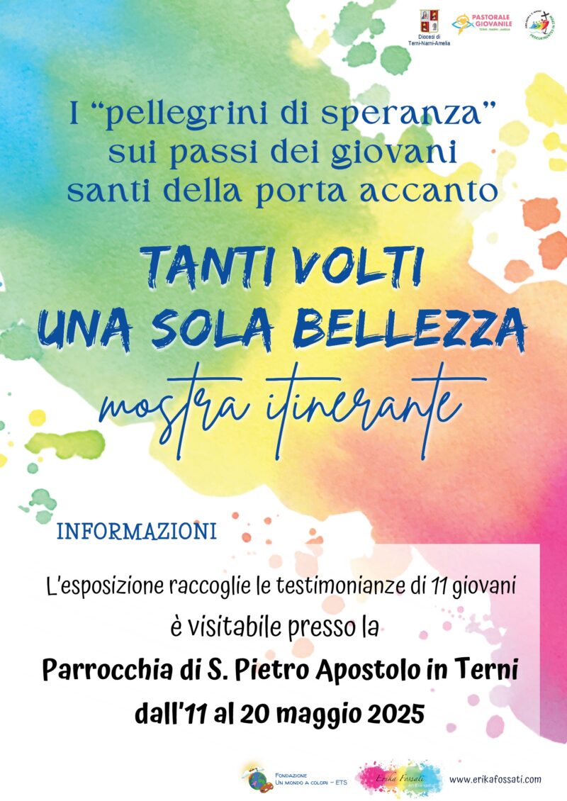 Venerdì16 maggio nella chiesa di S. Pietro a Terni alle ore 18 la Concelebrazione e subito dopo l’adorazione Eucaristica, animata da P. Massimo Reschiglian, animatore della Mostra dei Giovani santi che sarà in esposizione dal l’11 al 20 maggio in chiesa. La mostra itinerante “Tanti volti una sola Bellezza” promossa dalla Pastorale giovanile della Diocesi, in collaborazione con p. Massimo Reschiglian ofm e la Fondazione “Un mondo a colori” – ETS, consta di dieci pannelli, nella forma di banner roll-up (espositori autoportanti di cm. 85 x 200) e può essere installata con facilità all’interno della Chiesa parrocchiale. I pannelli riproducono i volti di dieci giovani “santi della porta accanto” ritratti dalla nota artista Erika Fossati, e sono corredati da una breve biografia e un QR-code per ricerca e approfondimenti.