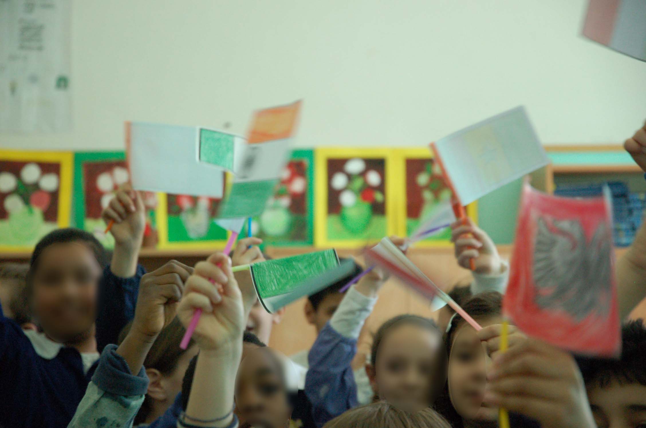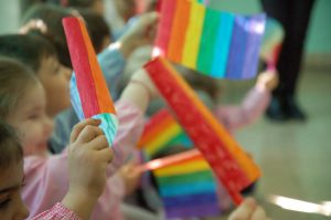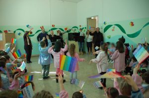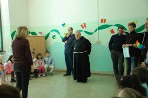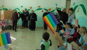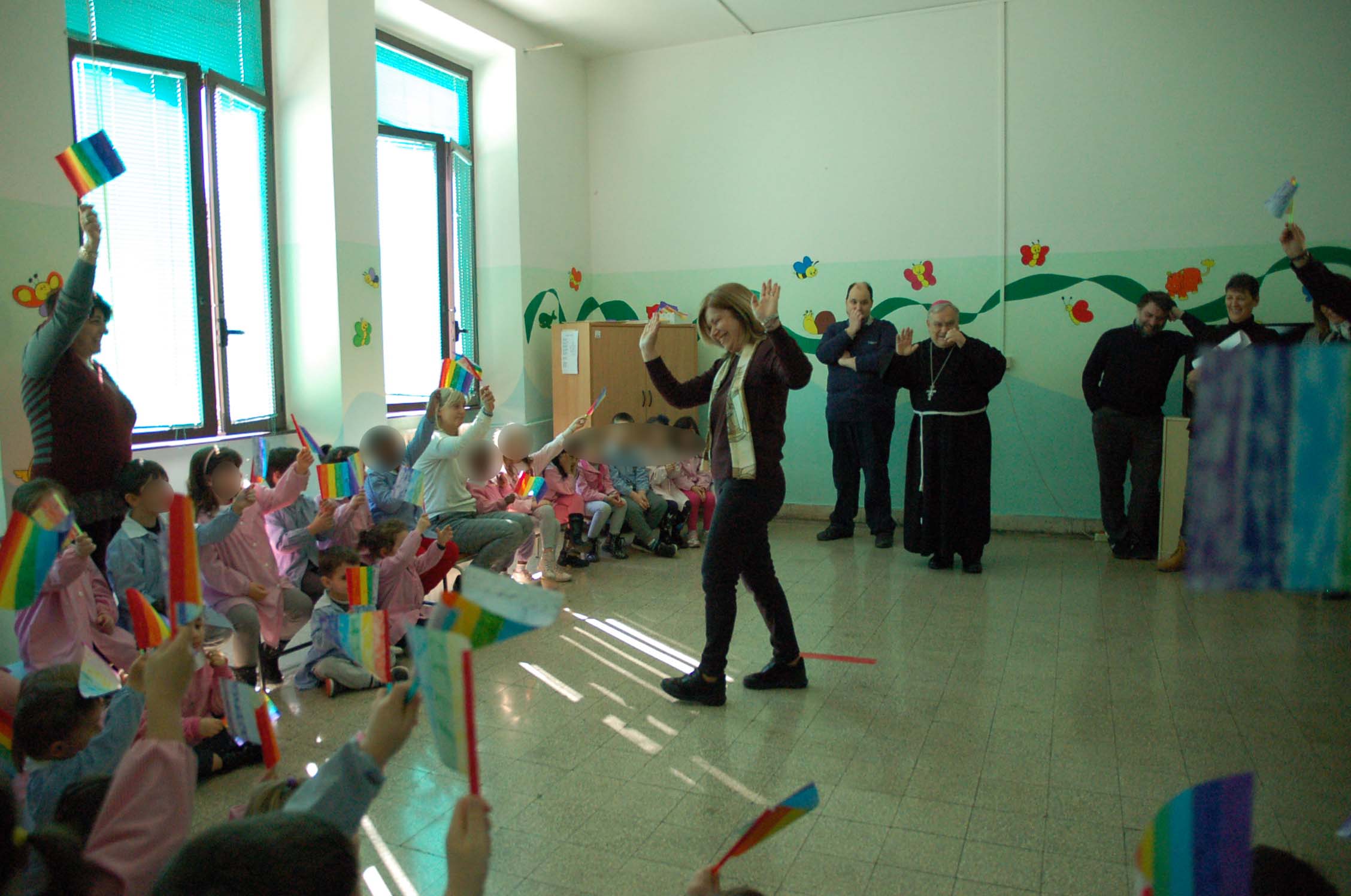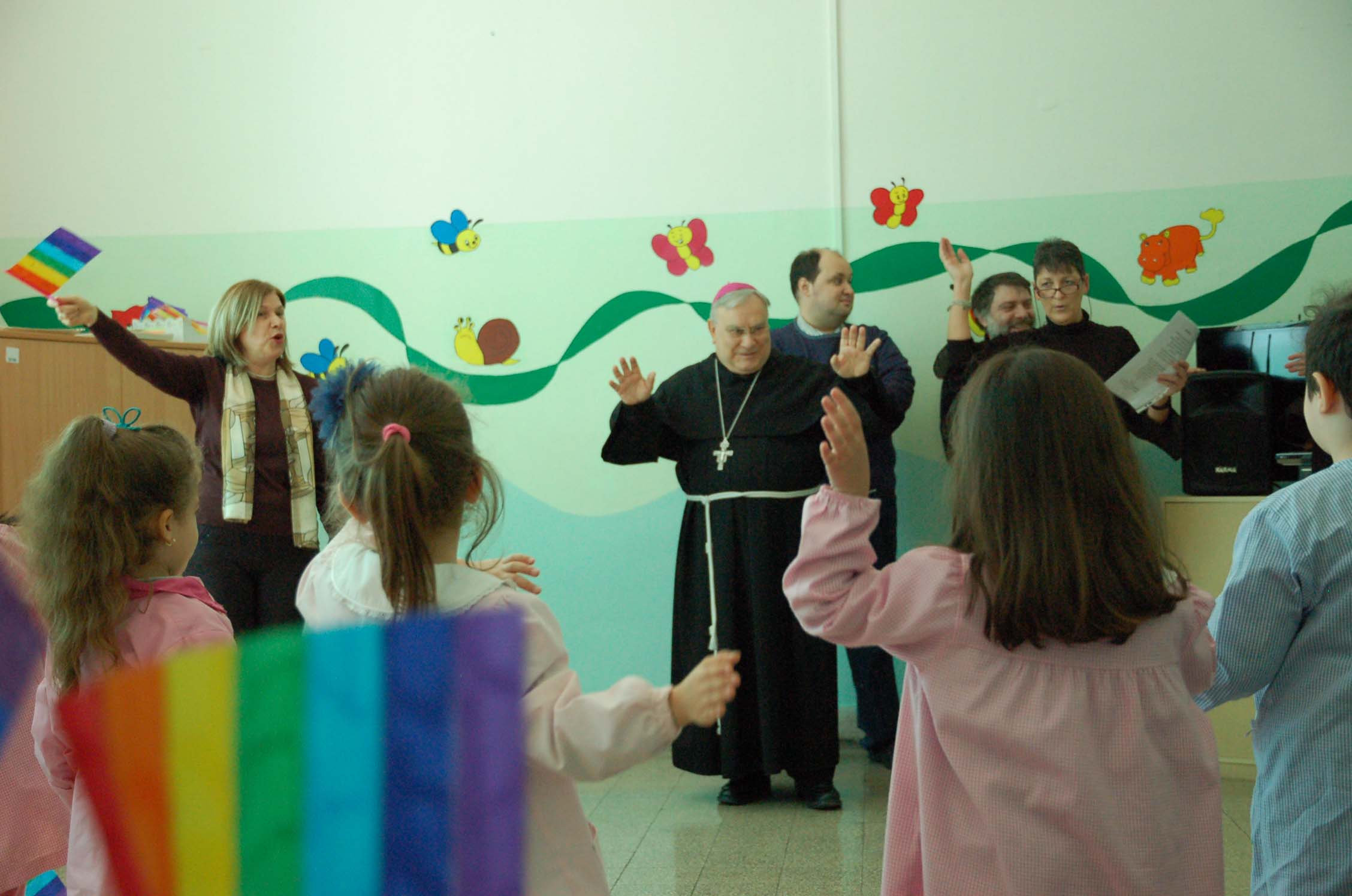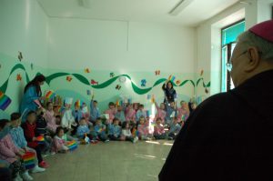 I bambini della scuola dell’infanzia hanno accolto il vescovo con un canto di benvenuto e con bandierine colorate arcobaleno.