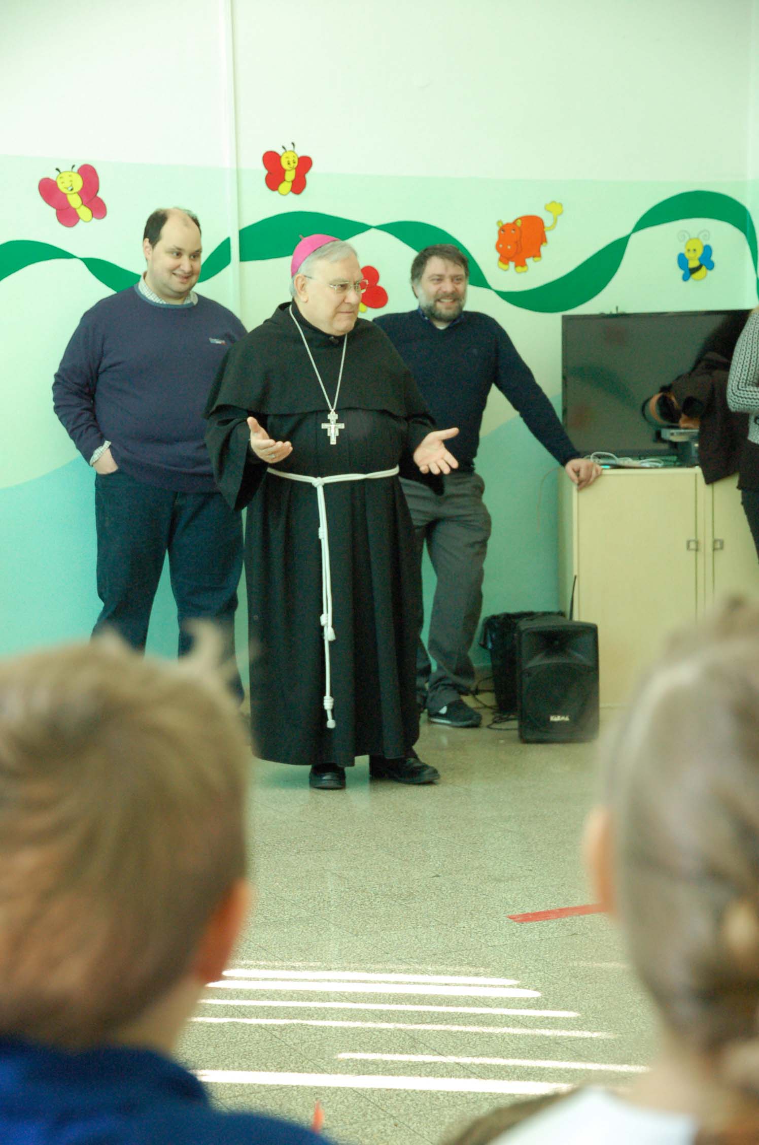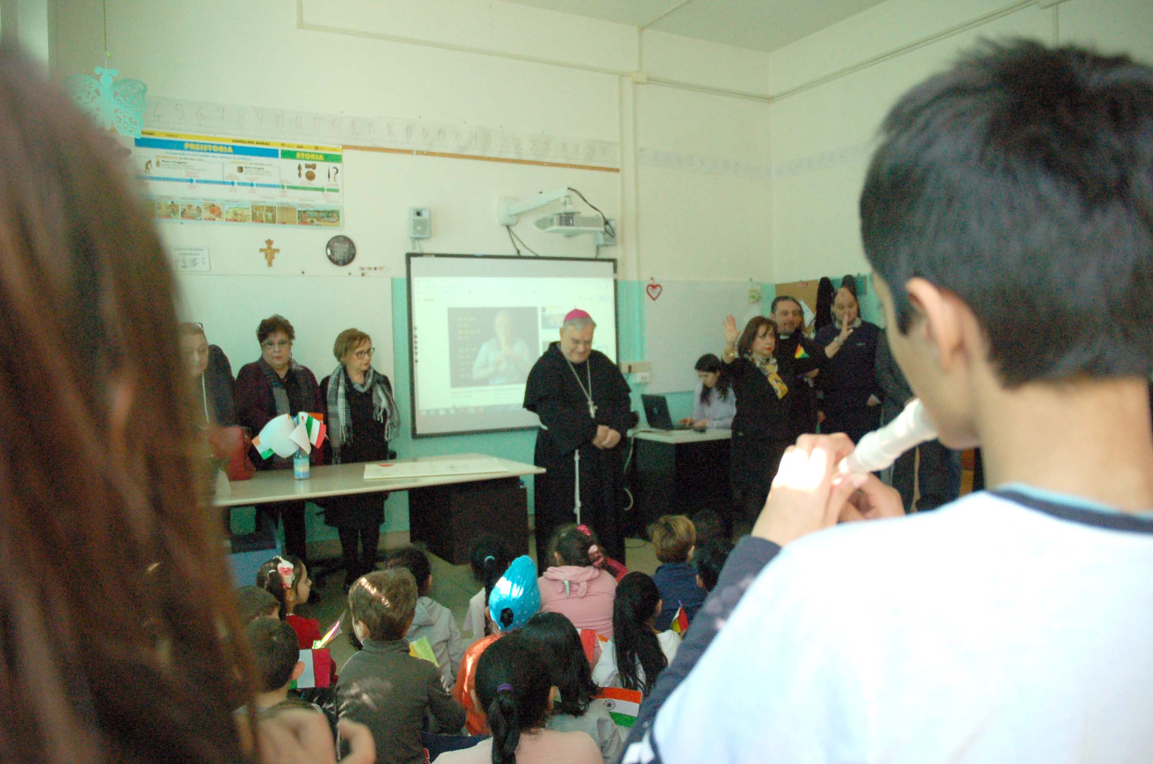 I bambini delle classi della primaria hanno accolto il vescovo con le bandierine con gli stemmi dei vari Stati da cui provengono alcuni degli studenti, l’esecuzione al flauto del brano “Dolce sentire” che hanno poi cantato in coro. Il vescovo ha poi risposto alle domande dei bambini parlando della sua vocazione, della sua missione e della sua esperienza al Sacro Convento di Assisi e di San Francesco e del Cantico delle Creature con un riferimento anche alle recenti questioni sull’ecologia e la salvaguardia del creato, nel mondo globalizzato.