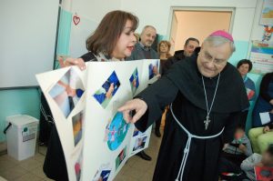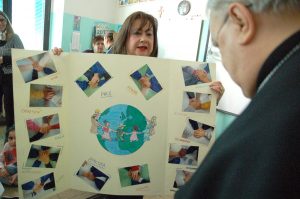 I ragazzi hanno donato poi al vescovo un grande cartellone con le foto delle loro mani che si uniscono in segno di pace e fratellanza.