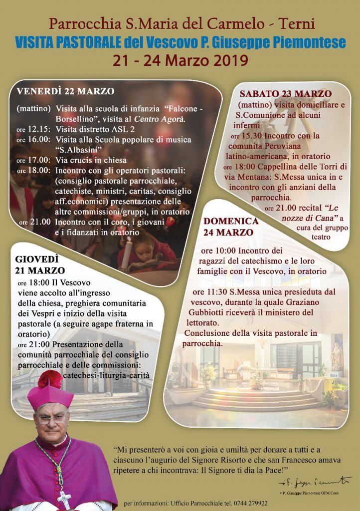 Dal 21 al 24 marzo 2019 il vescovo sarà in visita pastorale alla parrocchia di Santa Maria del Carmelo a Terni.
