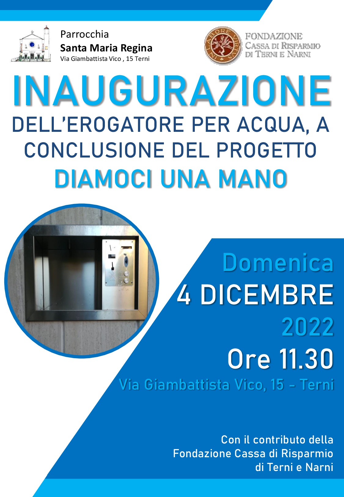 Domenica 4 dicembre alle ore 11.30 nella parrocchia Santa Maria Regina a Terni sarà inaugurato l’erogatore per acqua posto all’ingresso dell’oratorio adiacente alla chiesa di via Vico. Uno strumento a disposizione di tutti, che rappresenta un’opera concreta del progetto “Diamoci una mano” realizzato con il contributo della Fondazione Carit.