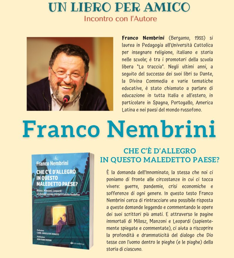 L’autore sarà a Terni per presentare il suo ultimo libro: “Che c’è d’allegro in questo maledetto paese?” (Ed. Tau, 2024), nel quale cerca di rispondere al perché delle crisi del nostro tempo leggendo e commentando le opere dei suoi scrittori più amati. Attraverso le pagine immortali di Milosz, Manzoni e Leopardi, Nembrini aiuterà a riscoprire la profondità e la drammaticità del dialogo che Dio tesse con l’uomo dentro le pieghe (e le piaghe) della storia di ciascuno.