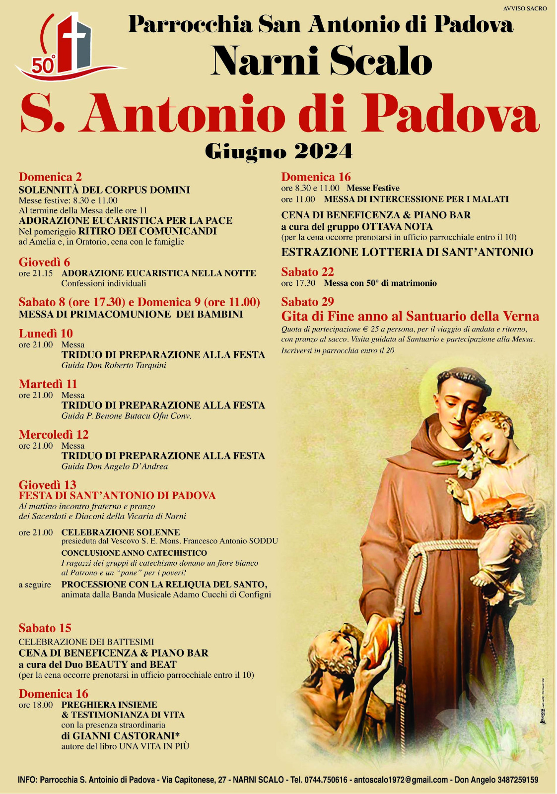 Dal 10 al 16 giugno festa patronale dedicata a Sant’Antonio di Padova con celebrazioni del triduo di preparazione alla festa e la solenne celebrazione del 13 maggio alle ore 21 presieduta dal vescovo Francesco Soddu, concelebrata dal parroco don Angelo D’Andrea, dal vicario foraneo don Jeanpierre Kalongisa e da alcuni sacerdoti della Vicaria di Narni, animata dalla corale parrocchiale.