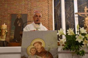 Il vescovo nell’omelia ha ricordato l’imminente Giubileo e la preprazione a vivere “un anno di misericordia in cui Dio manifesta il suo perdono, il suo amore grande – ha detto mons. Soddu. Un messaggio di speranza per tutti e in particolare per i poveri perchè anche per loro c’è un posto nella storia. La liberazione dei prigionieri che significa che le prime prigioni ad essere liberate sono le prigioni della nostra interiorità, del nostro cuore inquieto. Così come era sant’Antonio, dalla vita inquieta che ebbe una svolta dopo aver visto il rientro dei Protomartiri francescani martirizzati. Decide di seguire le loro orme verso il martirio, anche se poi la sua vicenda lo porterà verso altre missioni: seguire la via di Francesco, seguendo la povertà evangelica di svuotamento di sé stessi per ricevere la ricchezza di Dio. Tutti apparteniamo a Dio, seguiamo perciò la via di sant’Antonio che nelle sue inquirudini e miserie si è affidato a Dio ed ha testimoniato nella predicazione e nell’esempio di vita la bellezza dell’amore”.