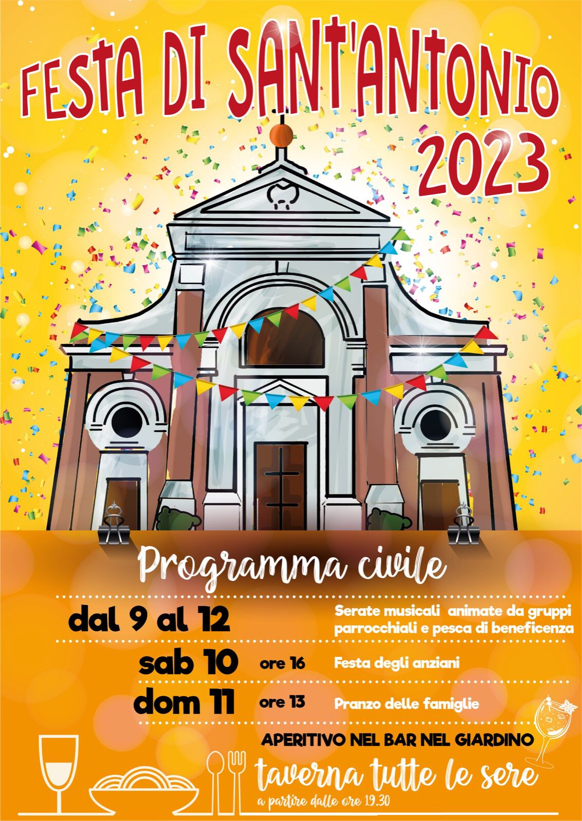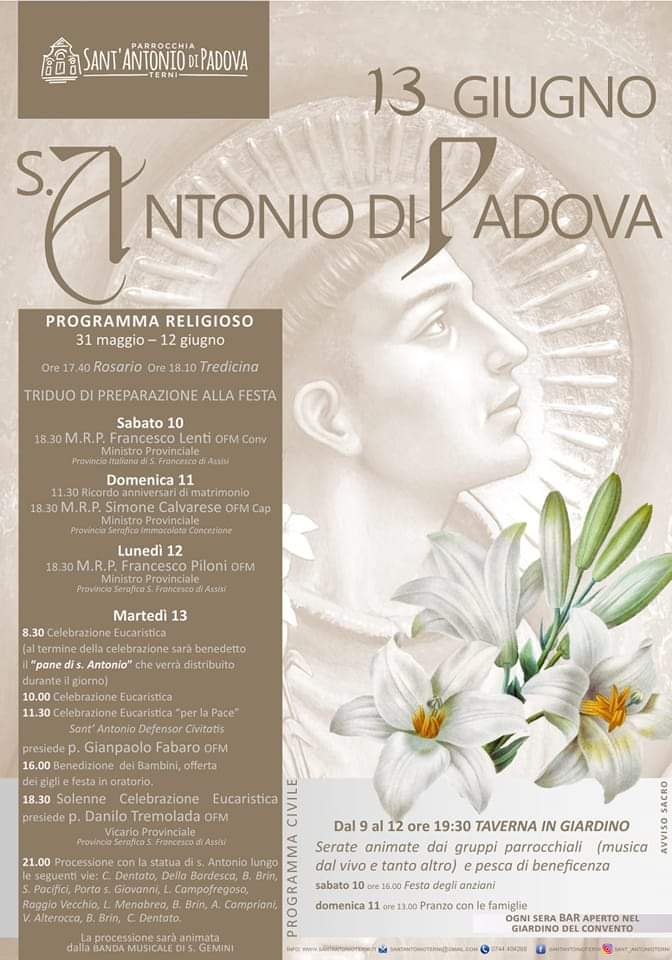 Ore 18.30 Solenne Celebrazione Eucaristica presiede p. Danilo Tremolada OFM, vice provinciale Provincia serafica San Francesco di Assisi. Ore 21 Processione con la statua di Sant’ Antonio lungo via C. Dentato, via della Bardesca, viale Brin, via Pacifici, via di Porta San Giovanni, via Campofregoso, via del Raggio Vecchio, Menabrea, vaile Brin, A. Campriani, V. Alterocca, viale Brin, via C. Dentato. La processione sarà animata dalla Banda musicale di Sangemini.