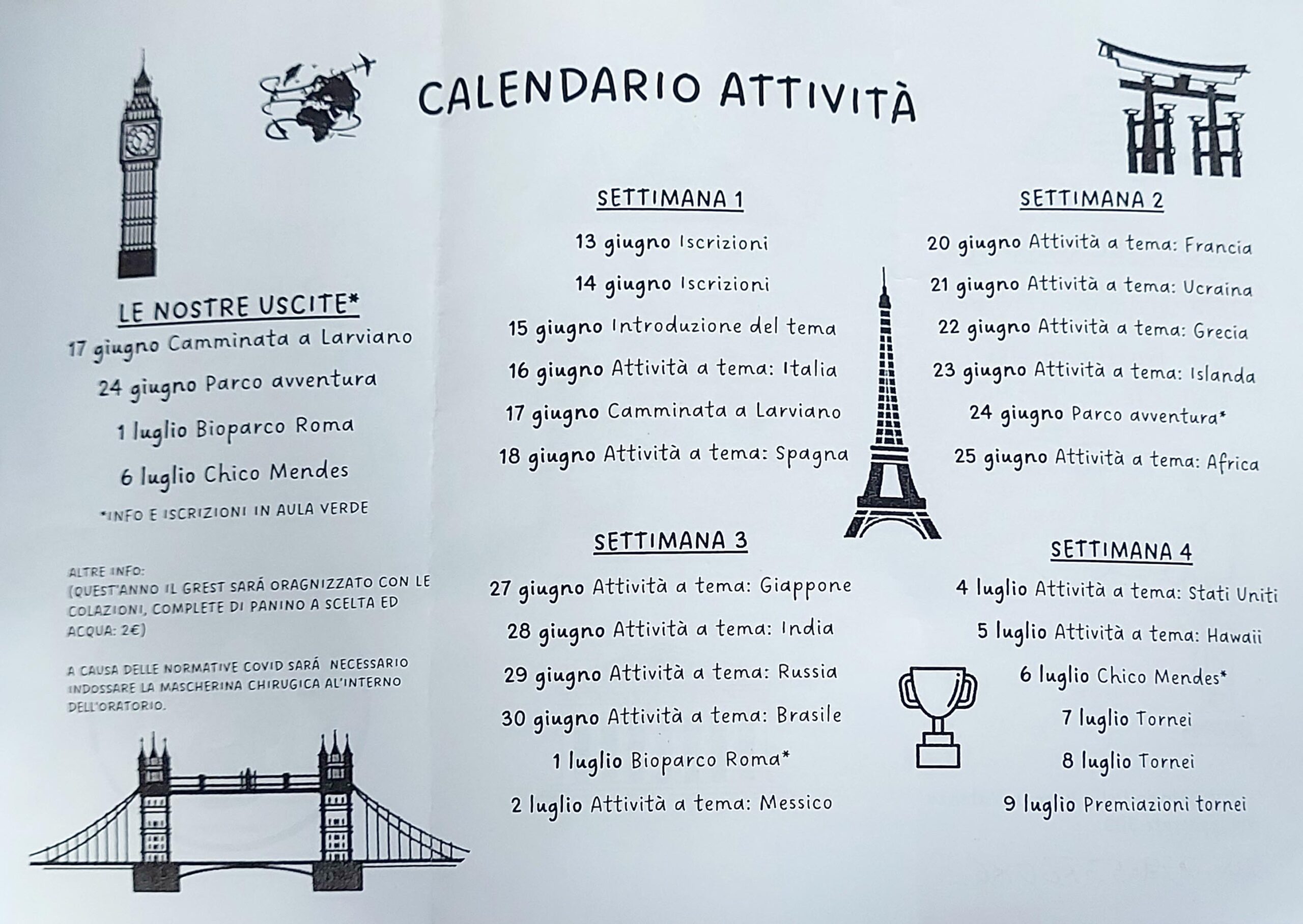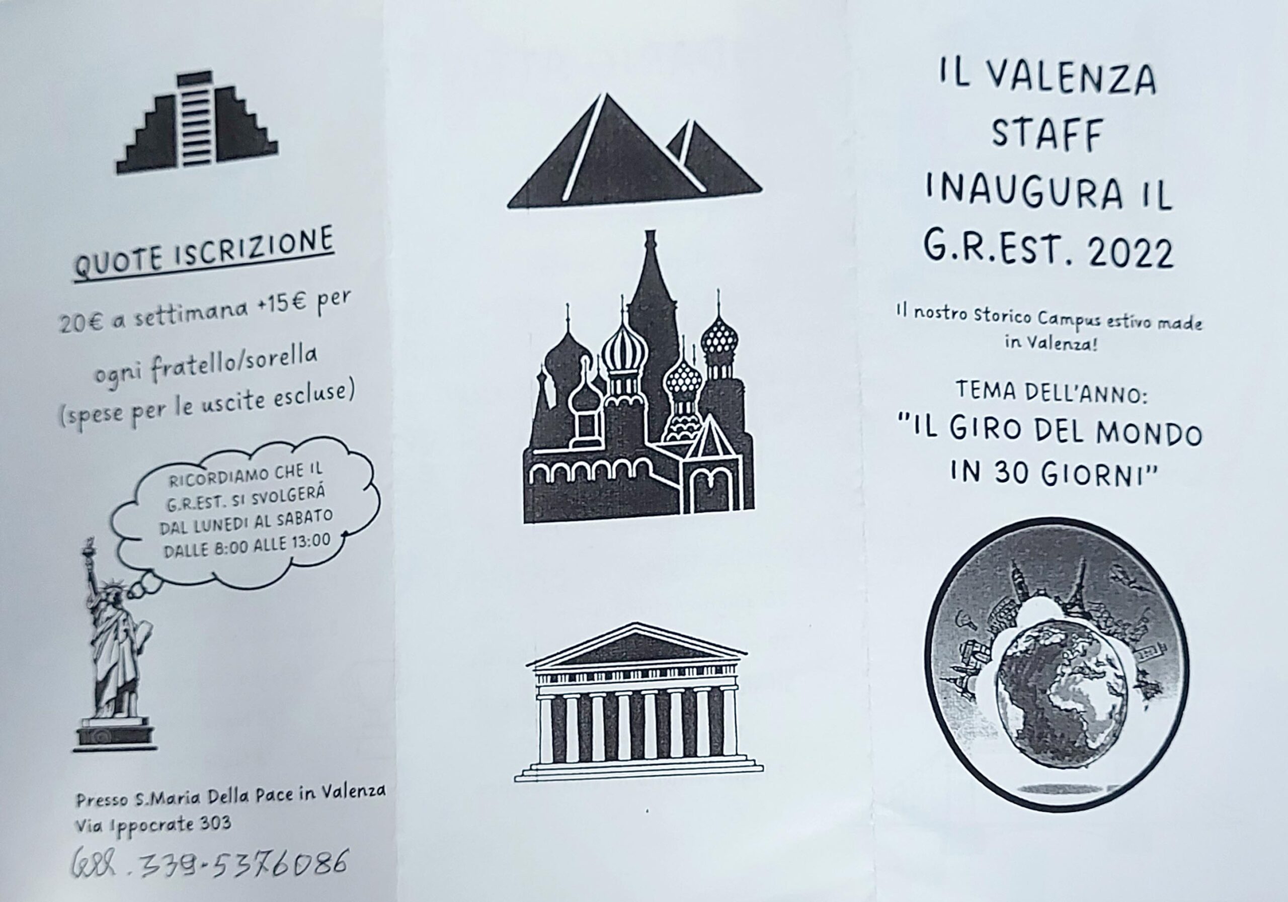 Da lunedì 13 giugno fino al 9 luglio appuntamento con il Grest nella parrocchia di Valenza dedicato a “Il giro del mondo in 30 giorni”. Ogni giorno, dal lunedì al sabato, attività dalle 8 alle 13 in oratorio e alcune uscite come la camminata fino a Larviano (17 giugno), al parco Avventura (24 giugno), al Bioparco di Roma (1 luglio), al parco Chico Mendes (6 luglio) dove i ragazzi potranno usufruire anche delle piscine.
