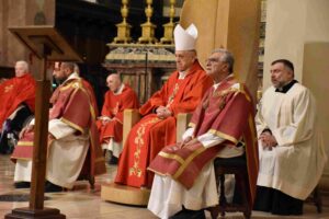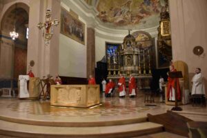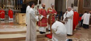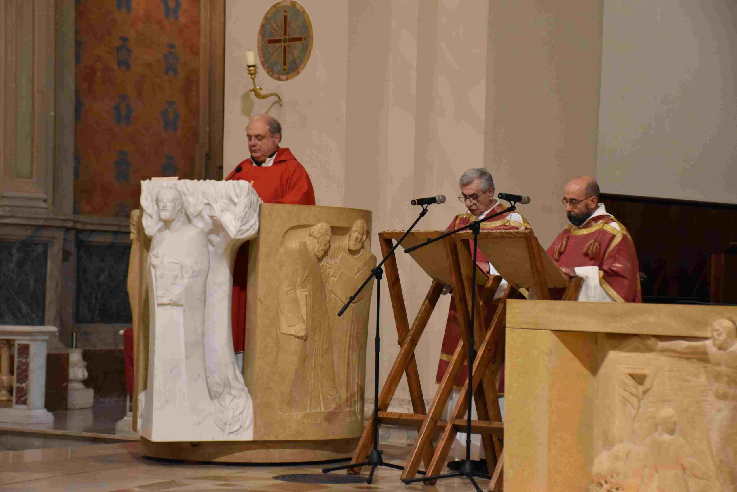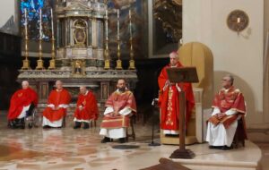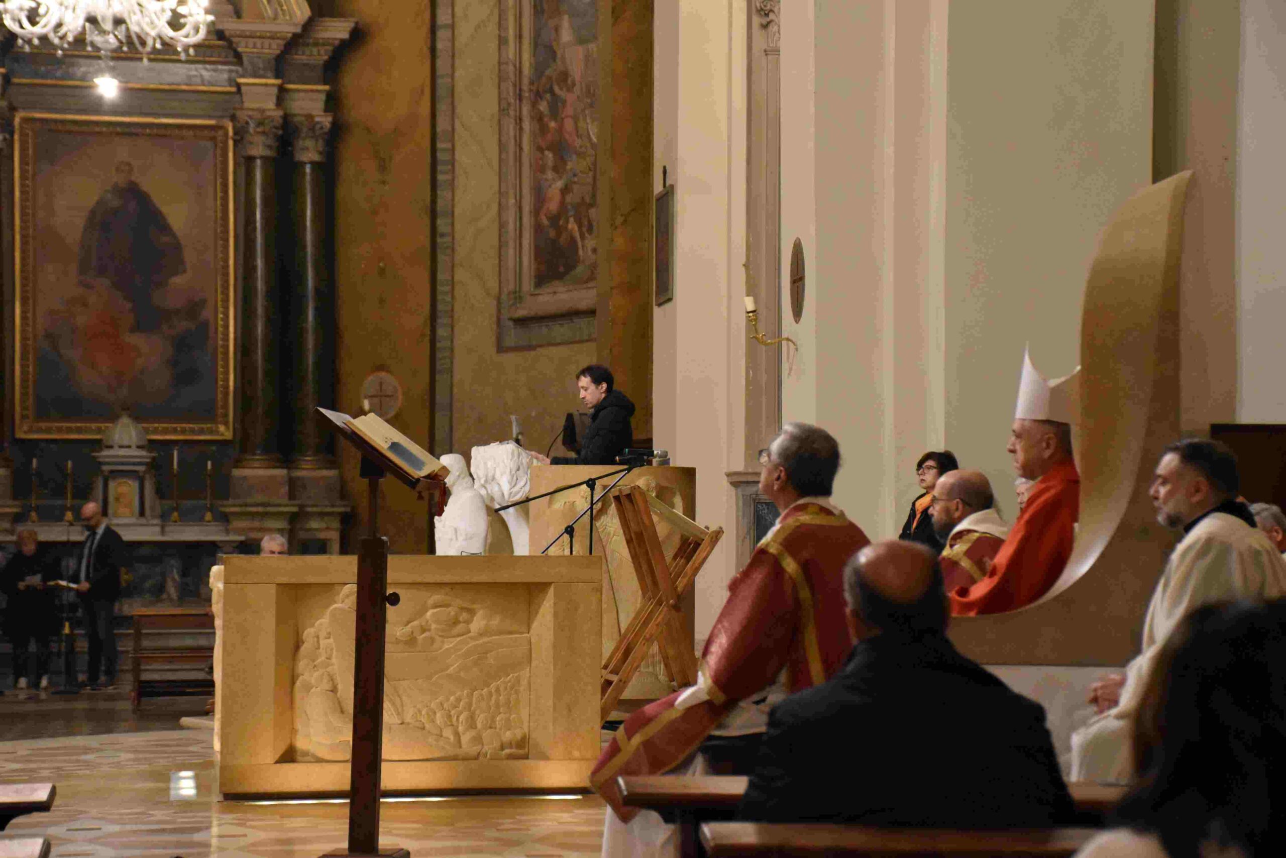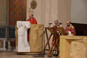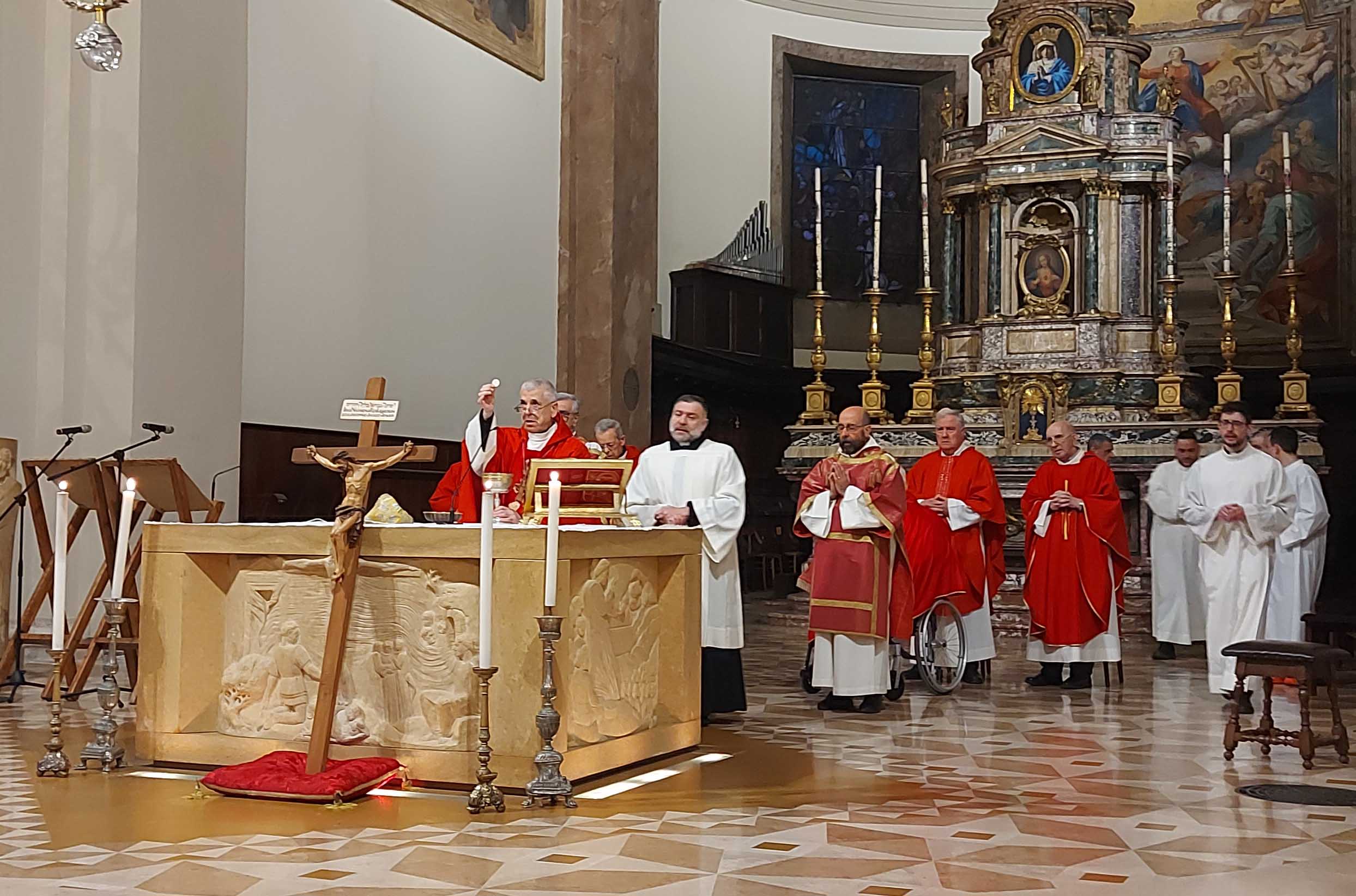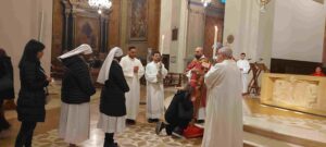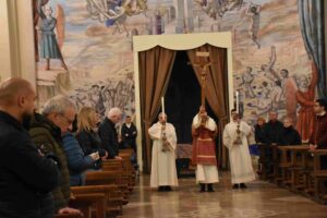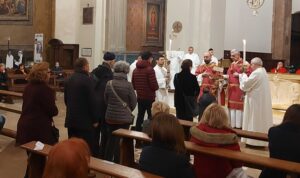 Celebrata nella Cattedrale di Terni dal vescovo Francesco Antonio Soddu la liturgia della passione del Signore con l’adorazione della croce. La processione d’ingresso dei sacerdoti che ha attraversato la navata della chiesa, iniziata nel silenzio senza canti, ha raggiunto l’altare spoglio, dove la celebrazione è proseguita con la proclamazione delle letture e del vangelo della Passione di Gesù, quindi lo svelamento della croce coperta d’un velo posta al fondo dellla chiesa e portata in processione all’altare con tre soste e innalzamenti della Croce, l’adorazione della Croce e l’Eucarestia. Hanno concelebrato don Salvatore Ferdinandi vicario generale della diocesi, don Antonio Maniero, don Alessandro Rossini, don Camillo Camozzi.