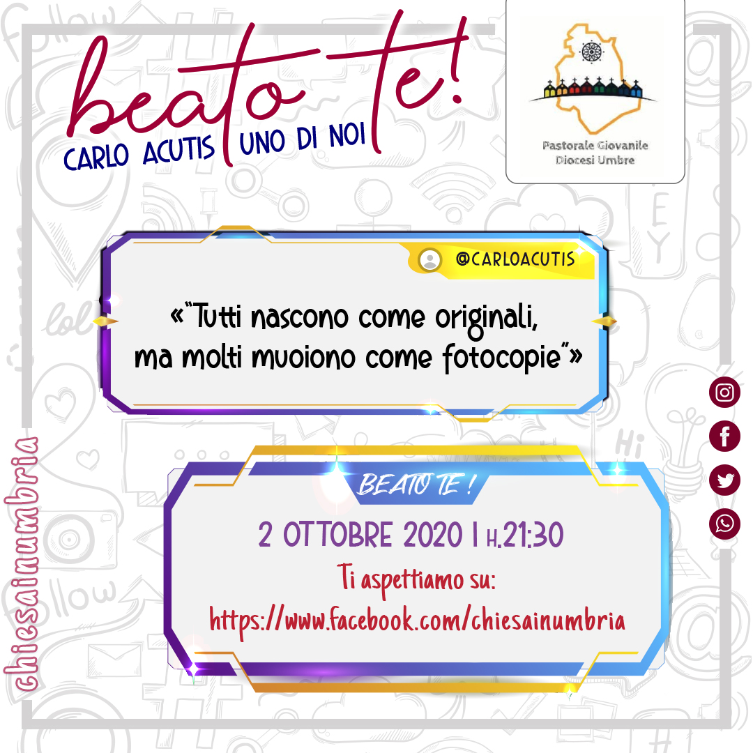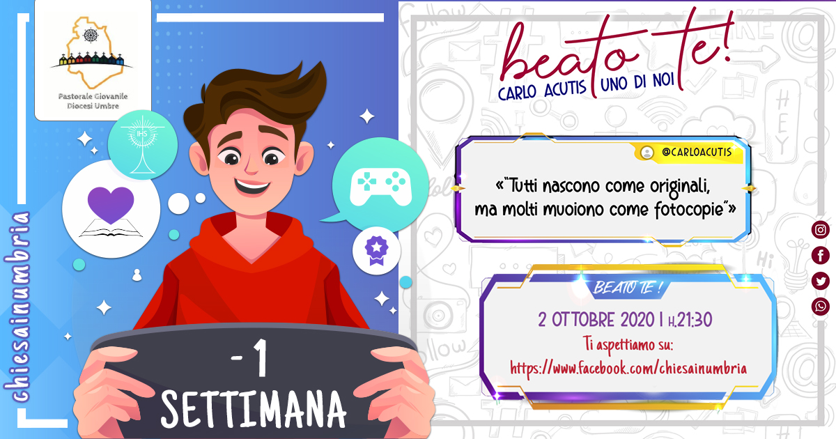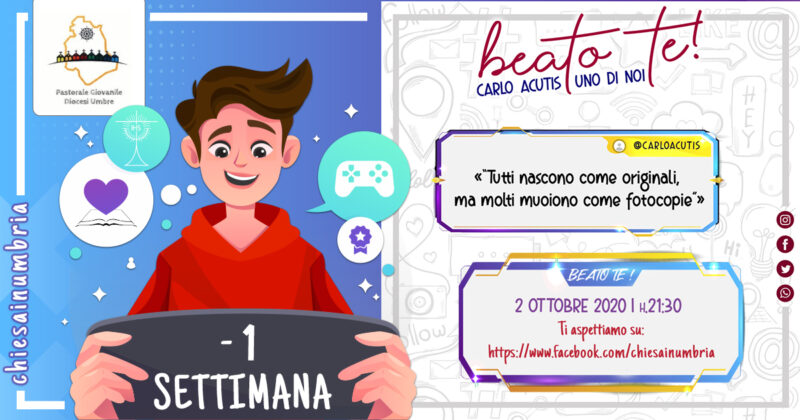 In occasione della beatificazione di Carlo Acutis, che si terrà il prossimo 10 ottobre, il servizio di pastorale giovanile dell’Umbria organizza l’evento online dedicato ai giovani “Beato Te: a scuola di felicità con Carlo Acutis” il 2 ottobre alle ore 21.30 sui canali Youtube e Facebook di Chiesainumbria.