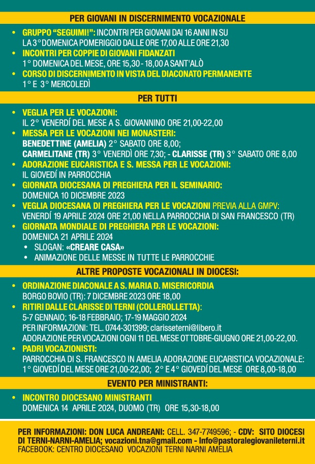 Il servizio di pastorale giovanile e vocazionale della diocesi propone vari momenti di incontro, fraternità e riflessione per i giovani. In particolare per giovani in discernimento vocazionale