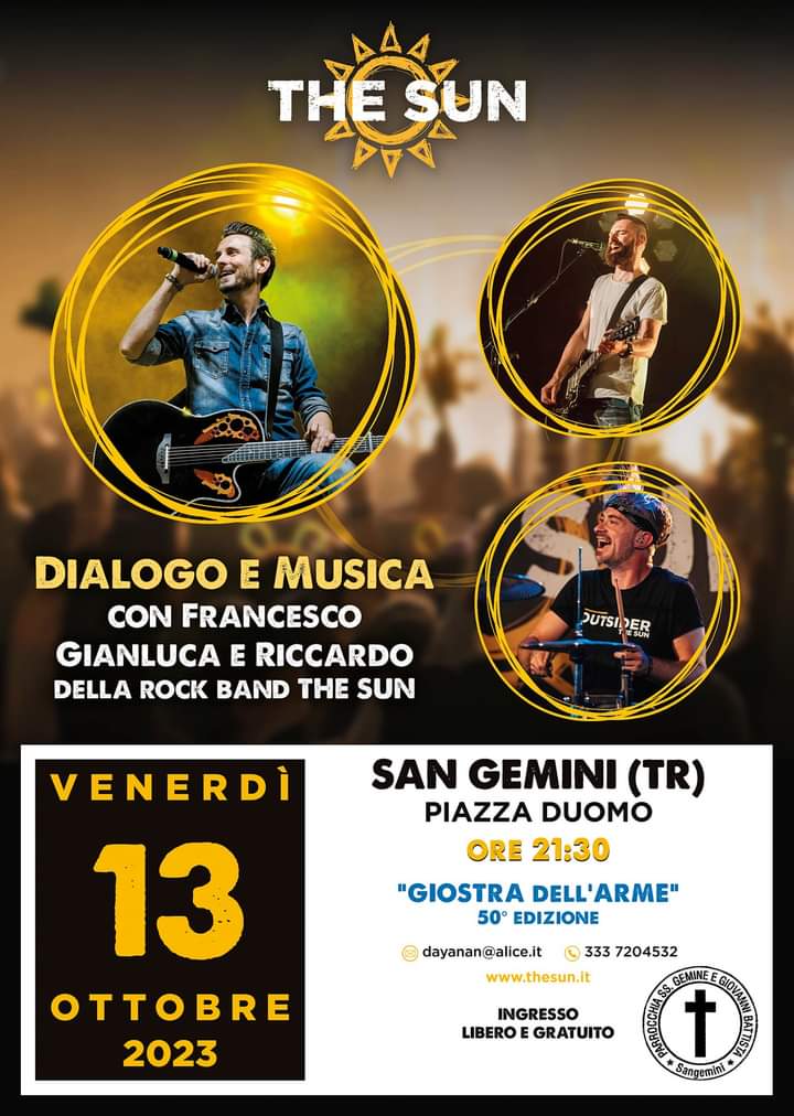 Il secondo incontro è per il concerto dei “The Sun” a Sangemini, venerdì prossimo 13 ottobre, nell’ambito dei festeggiamenti patronali e della giostra dell’arme.