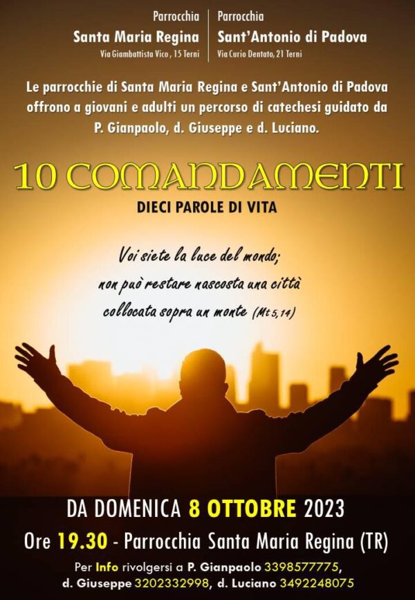 Due appuntamenti per i giovani della diocesi: l’inizio del percorso dei “10 comandamenti”, dieci parole di vita che si terrà nella parrocchia di Santa Maria Regina, da domenica 8 ottobre alle ore 19.30  guidato da don Luciano Afloarei, don Giuseppe Zen e padre Gianpaolo Fabaro.
