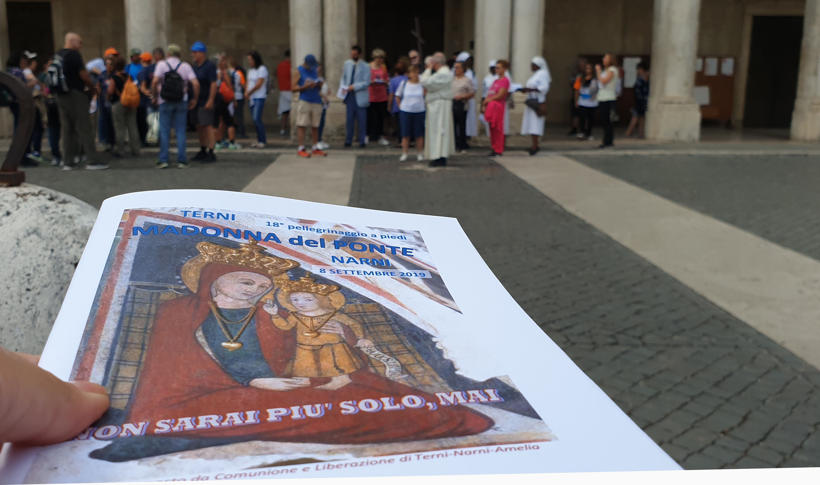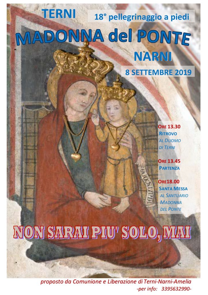 Domenica 8 settembre 2019 si terrà il 18° pellegrinaggio a piedi da Terni (Piazza Duomo) al santuario della Madonna del Ponte (Narni Scalo), dal titolo “Non sarai più solo, mai”, promosso dal gruppo diocesano di Comunione e Liberazione.