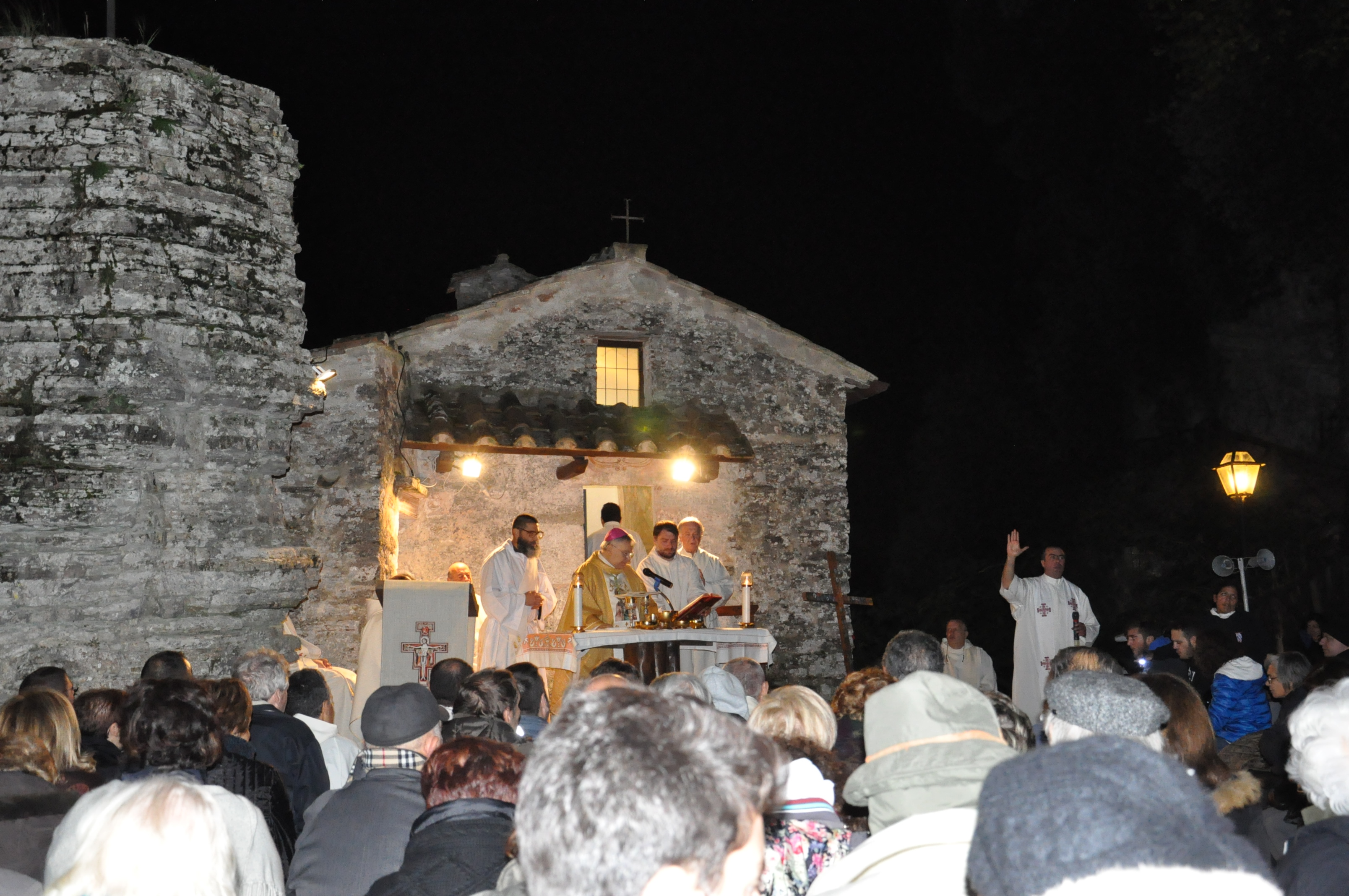 Allo Speco francescano si sono aggiunti numerosi altri pellegrini giunti da varie parti d’Italia che hanno partecipato alla celebrazione all’aperto, presieduta dal vescovo Giuseppe Piemontese davanti all’antica costruzione dell’originaria chiesetta e oratorio dove sostò San Francesco all’ombra del castagno secolare.