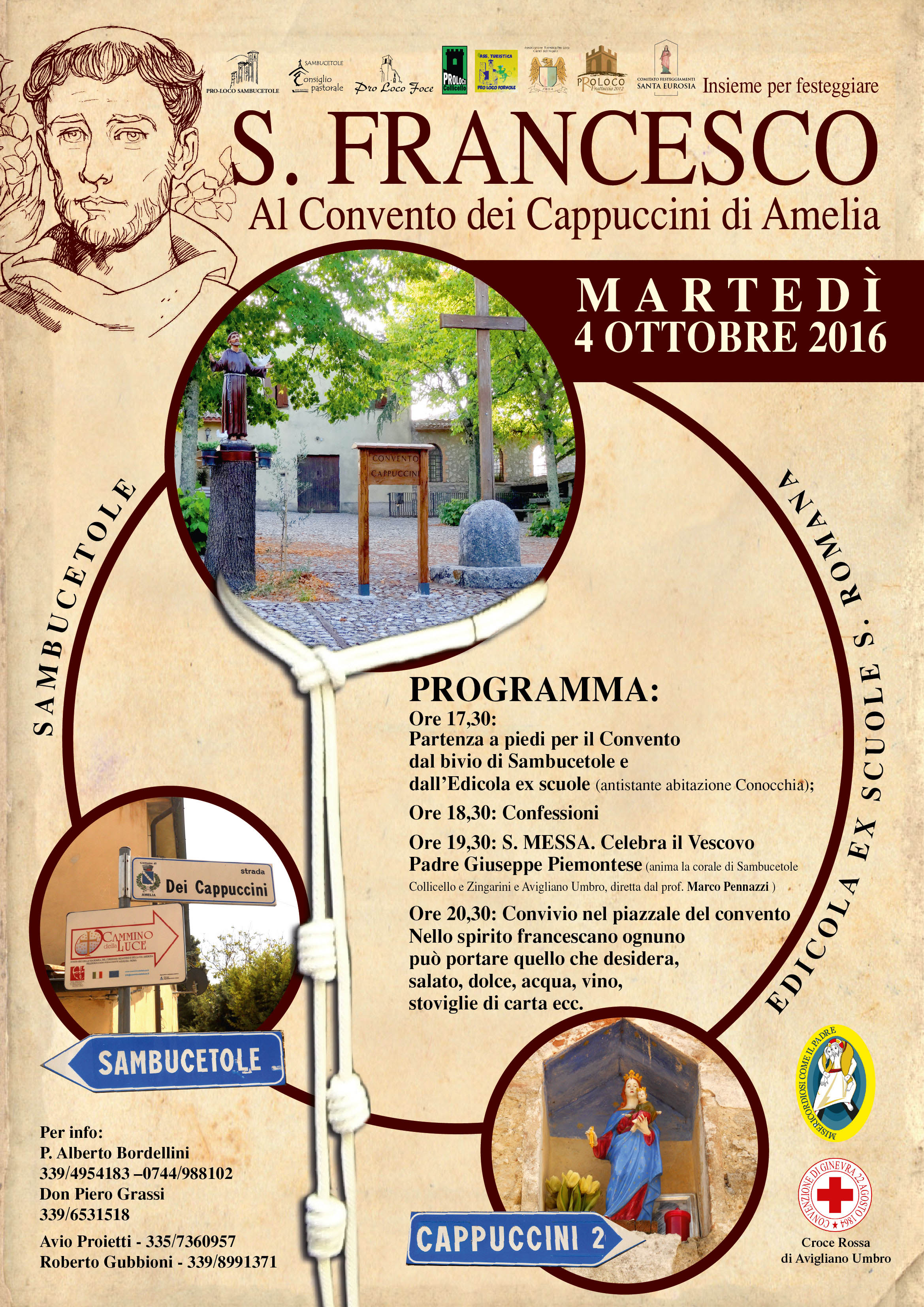 Il programma dei festeggiamenti prevede alle ore 17,30 la partenza a piedi per il Convento, lungo il percorso della Luce, dal bivio di Sambucetole e dall’edicola ex scuole S.Romana; lungo il percorso si faranno soste di preghiera e verrà richiesto a coloro che vivono lungo il percorso di accendere un lumicino per testimoniare il passaggio dei pellegrini (sarà comunque predisposto un servizio navetta per chi non potrà camminare).