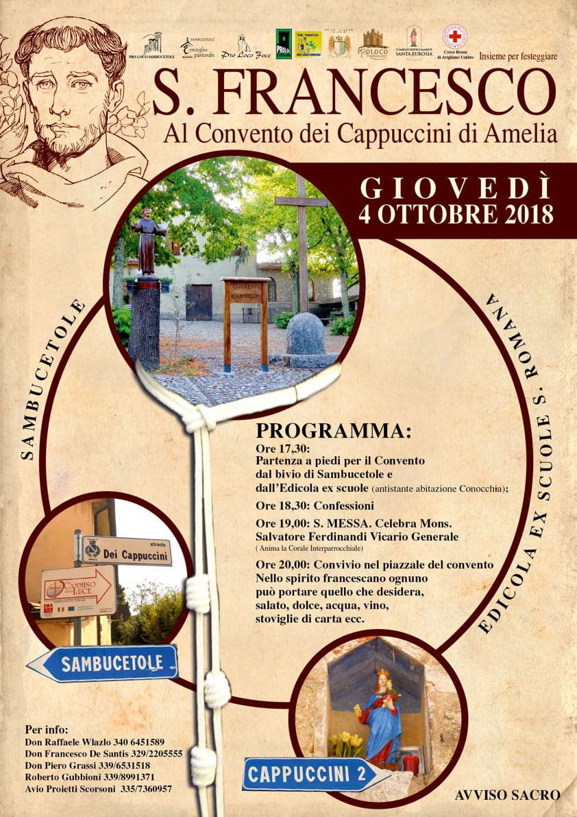 Giovedì 4 ottobre, presso il Convento dei Cappuccini di Amelia verrà festeggiato il Santo di Assisi insieme alle parrocchie di Avigliano Umbro, Acquasparta, Montecastrilli, Castel dell’Aquila, Collicello, Frattuccia, Foce, Sambucetole, Macchie, Capitone, Fornole e S. Giuseppe da Leonessa.