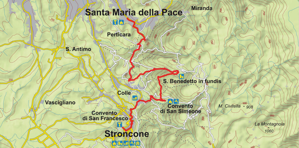 Le fonti d'acqua sono presenti presso il Monastero di San Simeone; in alcuni mesi dell'anno c'è acqua anche alla Fonte di San Benedetto in prossimità di San Benedetto in Fundis. Ricordarsi di riempire la borraccia con almeno 1,5 litri d'acqua in estate.