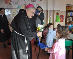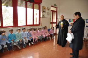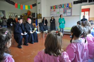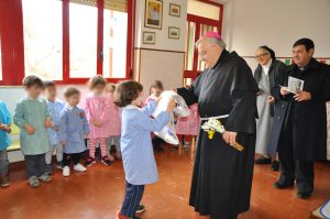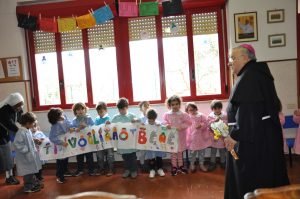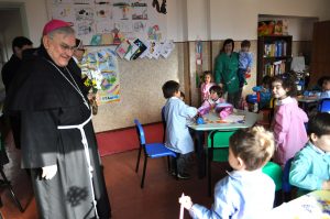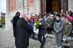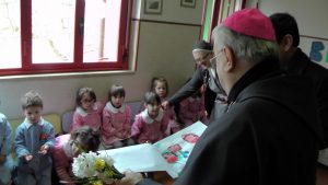 Donando un mazzo di fiori raccolti del giardino della scuola, i bambini hanno accolto festanti ed emozionati il vescovo, insieme a genitori e nonni.