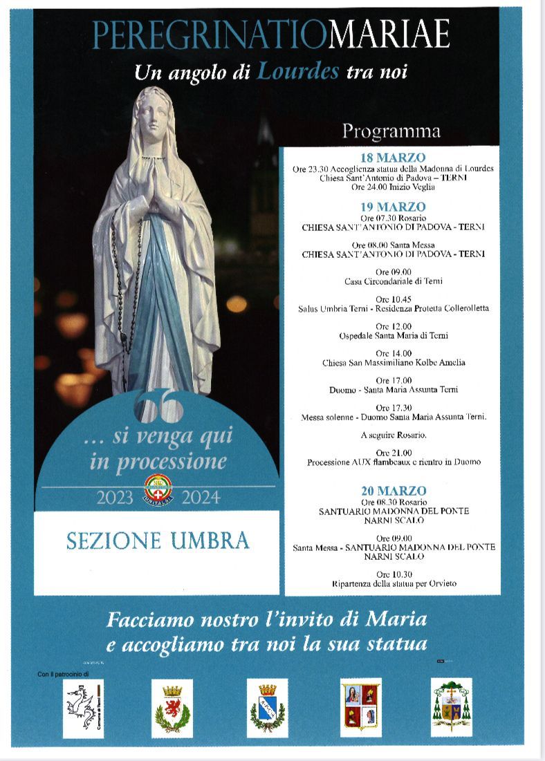La statua di Maria sarà a Terni il 18 marzo alle ore 23.30 accolta nella chiesa di Sant’Antonio di Padova dove ci sarà la veglia di preghiera notturna. Martedì 19 marzo, dopo la recita del Rosario delle 7.30, la statua della Madonna sarà trasferit apresso la Casa Circondariale di Terni, alle 10.45 alla residenza protetta di Collerolletta, quindi 12 all’Ospedale di Terni, alle 14 nella chiesa di San Massimiliano Kolbe ad Amelia. Il pellegrinaggio proseguirà a Terni dove alle 17 la statua sarà nella Cattedrale per la messa solenne alle ore 17.30 presieduta dal vescovo Francesco Antonio Soddu. Nella serata ci sarà la processione aux flambeaux per le vie del centro città. Il 20 marzo alle ore 8.30 la tappa al santuario della Madonna del Ponte di Narni scalo e alle 10.30 la partenza per Orvieto. La statua pellegrina della Madonna di Lourdes è una delle due utilizzate nel Santuario di Lourdes per la processione auxflambaux, ed ha iniziato il suo “peregrinare” in Italia partendo proprio dal Santuario di Lourdes al termine del Pellegrinaggio Nazionale Unitalsi dello scorso settembre, per dare avvio del nuovo tema dell’anno associativo “…e che qui si venga in processione” , – le parole della Vergine a Santa Bernadette nell’apparizione del 2 marzo 1858 (“Andate a dire ai sacerdoti che qui sicostruisca una cappella e che qui si venga in processione”).