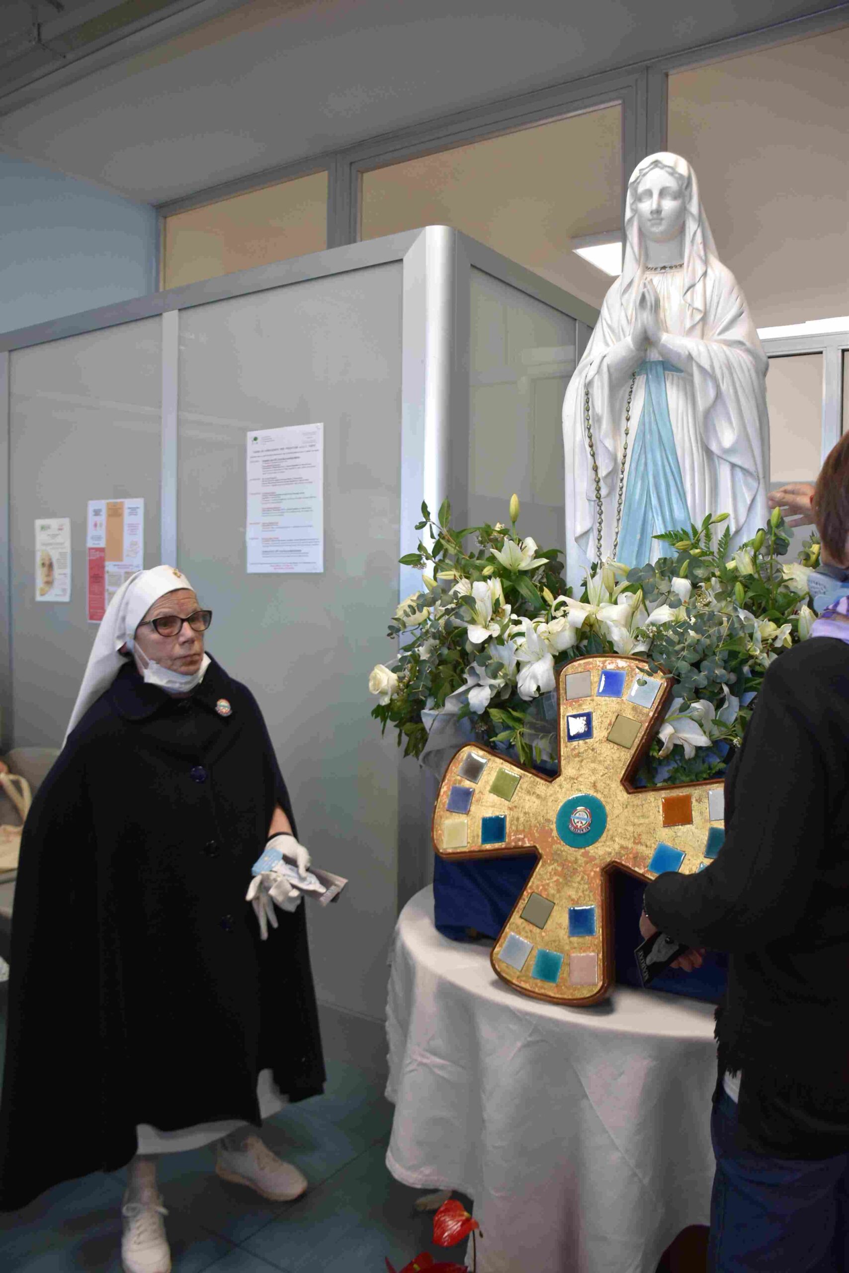 Con l’effige viaggia anche una croce che è stata completata dai presidenti di Sezione a Lourdes, a conclusione del pellegrinaggio nazionale di settembre scorso, composta da venti tasselli in pietra colorata, rappresentanti sia le venti Sezioni dell’Unitalsi, che i venti misteri del Rosario, rispettivamente i nostri territori che camminano con la Madonna, pregando il Rosario per la Pace, e invitando il popolo dei fedeli a “venire in pellegrinaggio”!