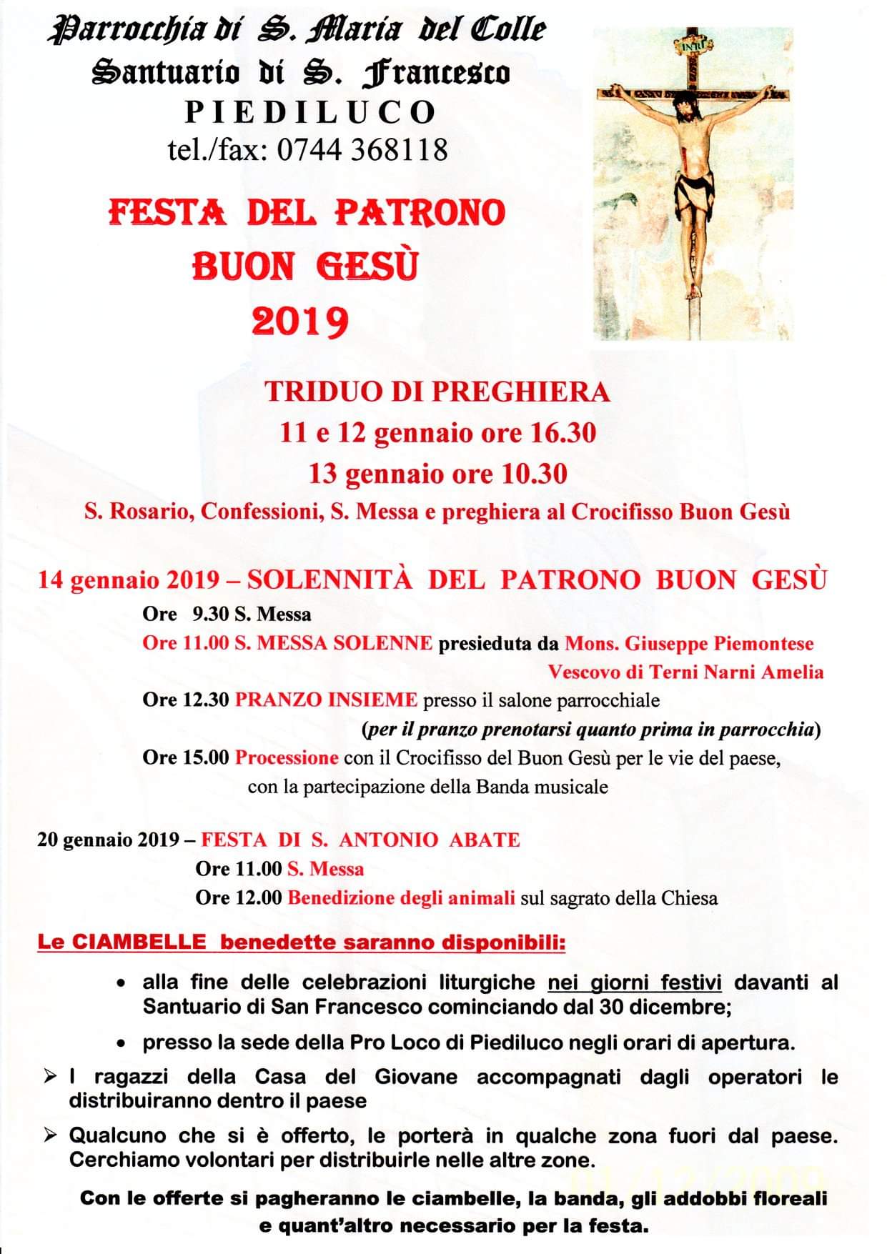 La parrocchia Santa Maria del Colle di Piediluco celebra la festa del Buon Gesù il 14 gennaio alle ore 11 con la messa solenne presieduta dal vescovo Giuseppe Piemontese e a seguire il pranzo nei saloni parrocchiali. Alle ore 15 ci sarà la processione con il Crocifisso del Buon Gesù per le vie del paese, con la partecipazione della Banda musicale.