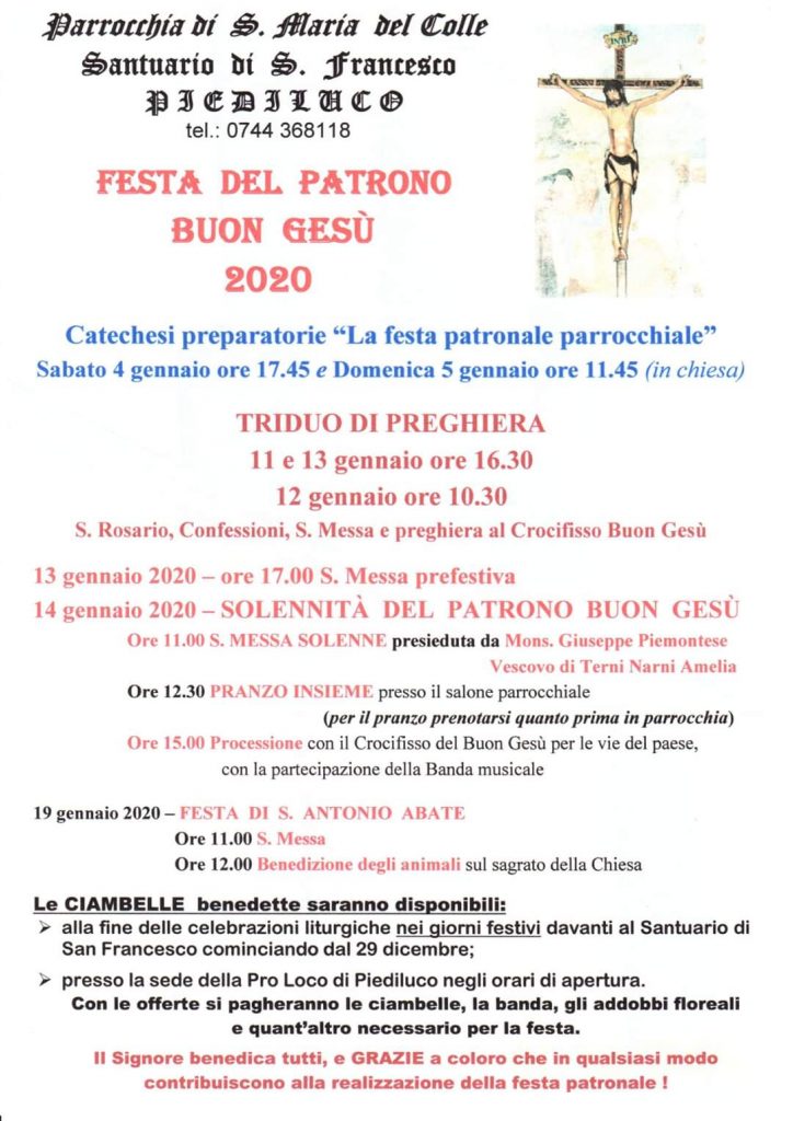 La parrocchia Santa Maria del Colle di Piediluco celebra la festa del Buon Gesù il 14 gennaio alle ore 11 con la messa solenne presieduta dal vescovo Giuseppe Piemontese e a seguire il pranzo nei saloni parrocchiali. Alle ore 15 ci sarà la processione con il Crocifisso del Buon Gesù per le vie del paese, con la partecipazione della Banda musicale.