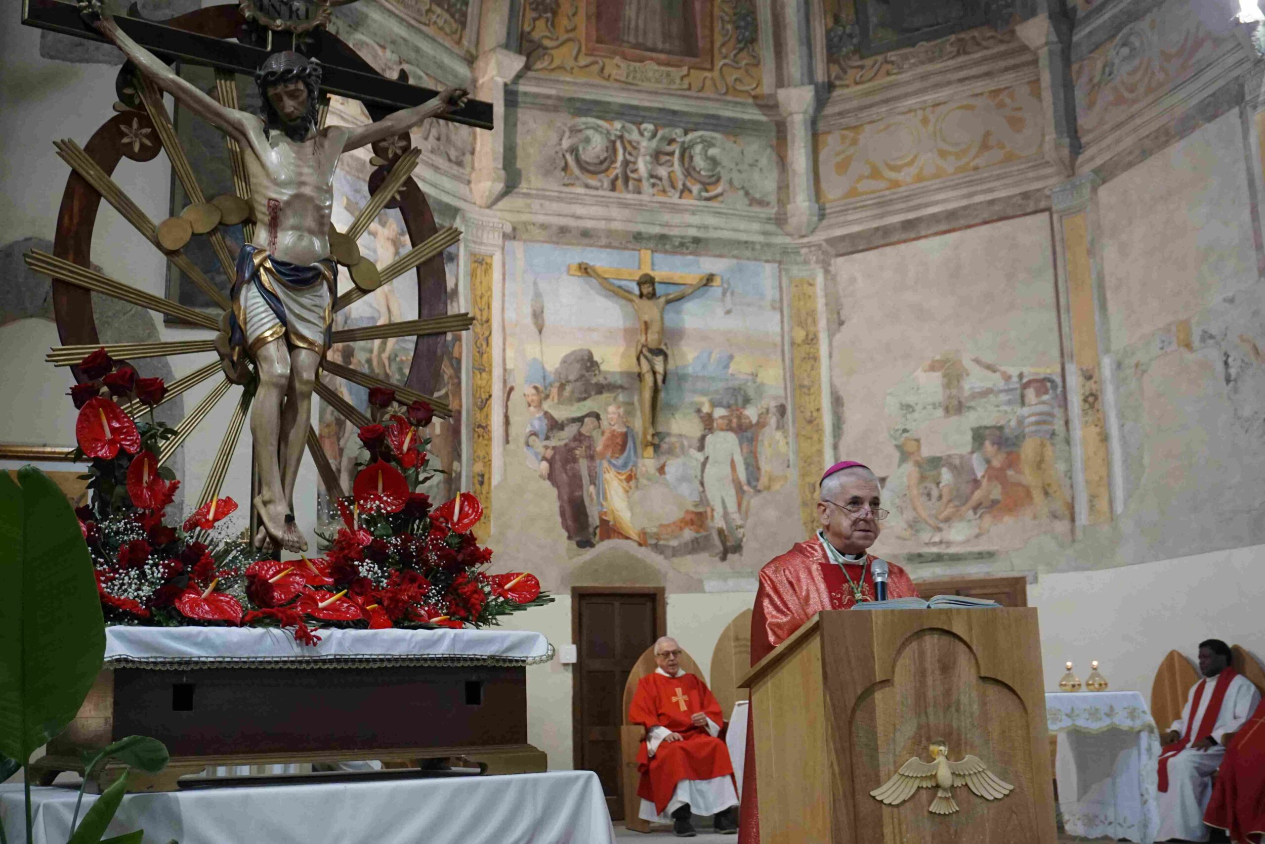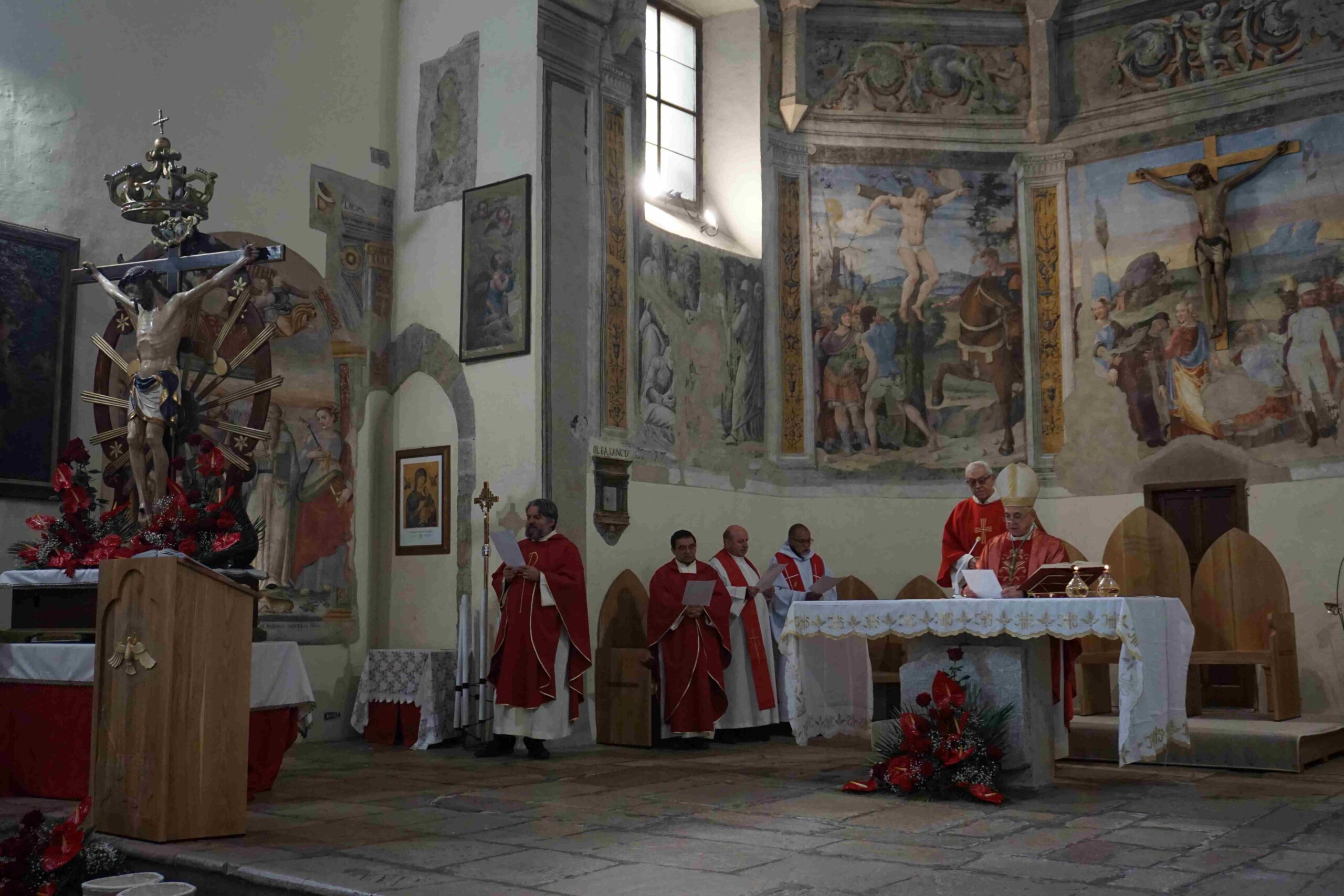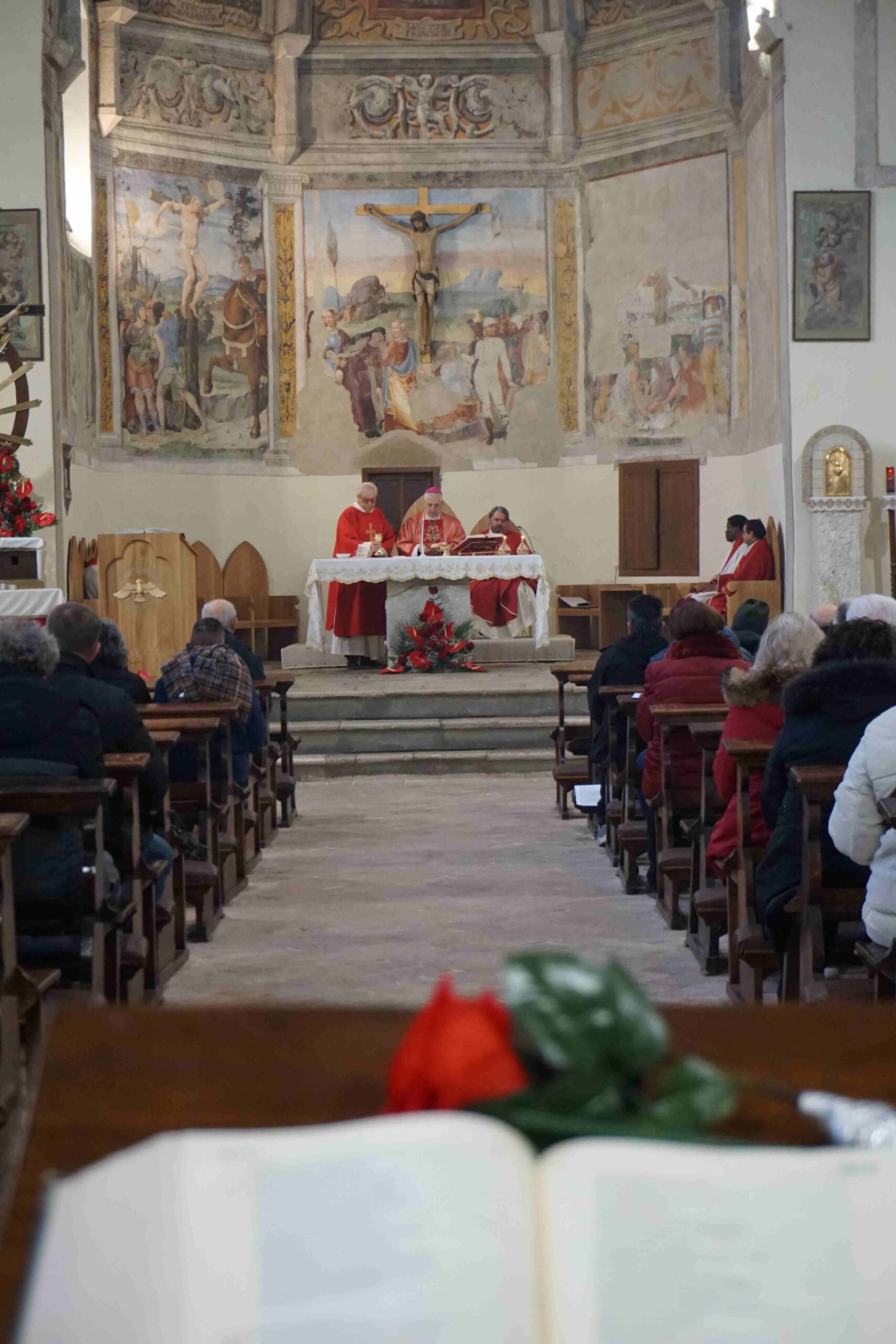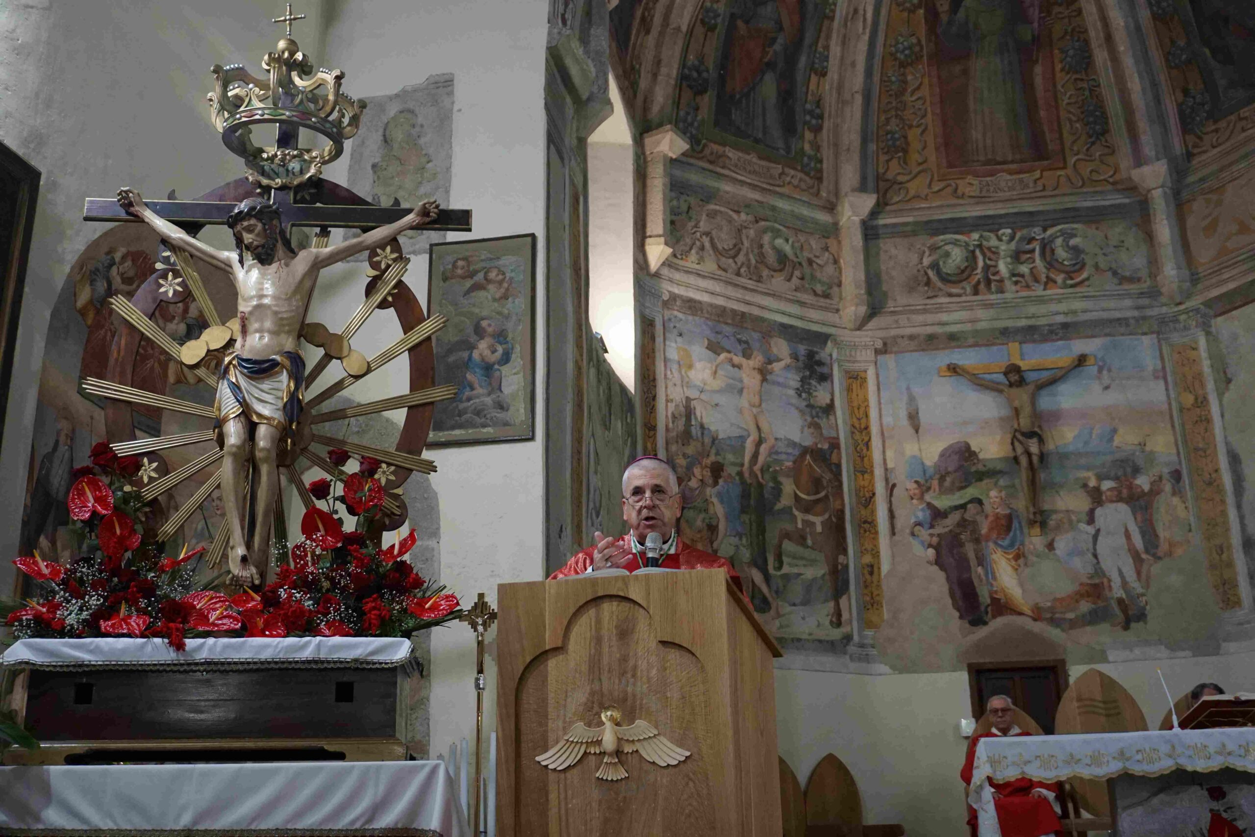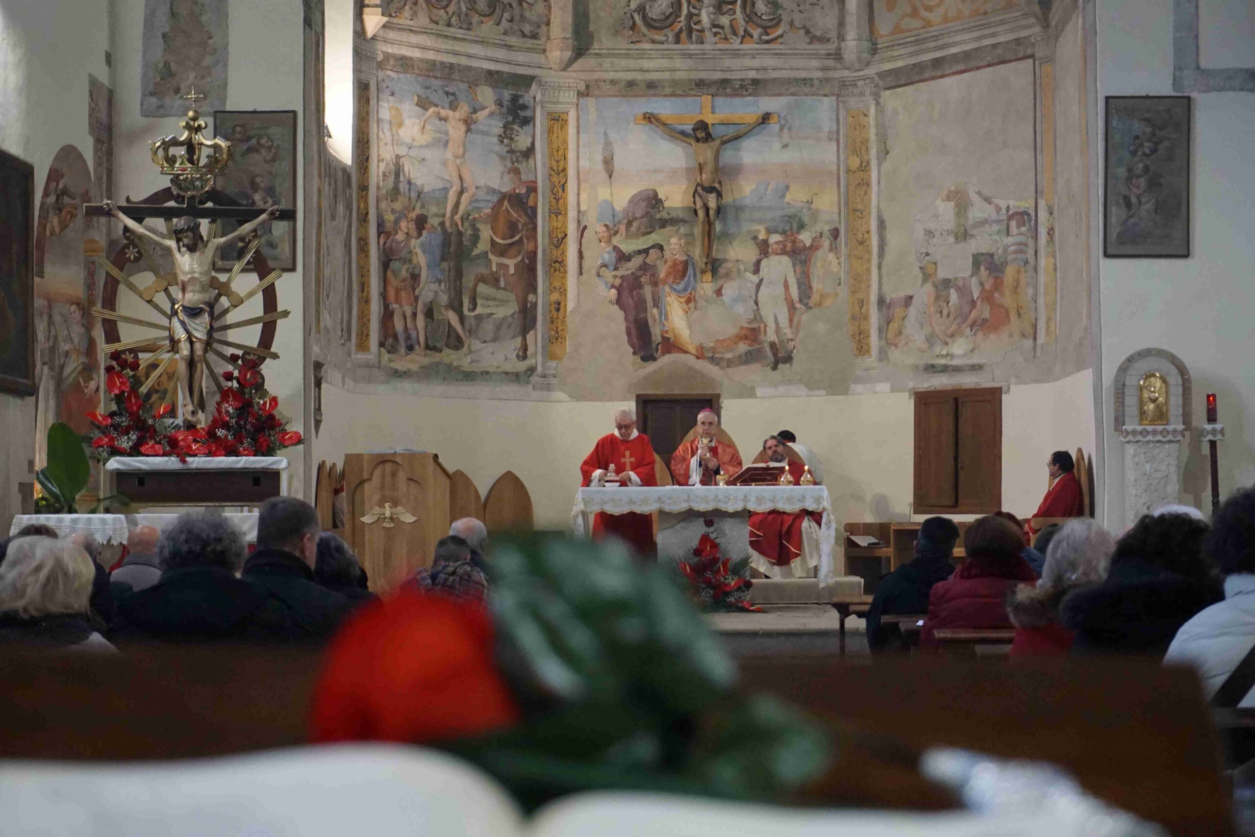 La parrocchia Santa Maria del Colle di Piediluco celebra la festa del Buon Gesù, patrono del borgo lacuste, mercoledì 14 gennaio alle ore 11 con la messa solenne presieduta dal vescovo Francesco Antonio Soddu nel santuario di San Francesco a Piediluco, dove è custodito il crocifisso del Buon Gesù, concelebrata dal parroco don Lorenzo Spezia, dal vicario foraneo di Terni 3 don Lisnardo Morales, da don Giovanni Ghergut e da don Conegundo e don John, e animata dalla corale parrocchiale. All’inizio della celebrazione il vescovo ha benedetto il nuovo ambone ligneo realizzato dall’artista Alban Guillon e raffigurante il borgo lacustre con i simboli della Madonna dell’Eco e della rocca e la colomba simbolo dello Spirito Santo.