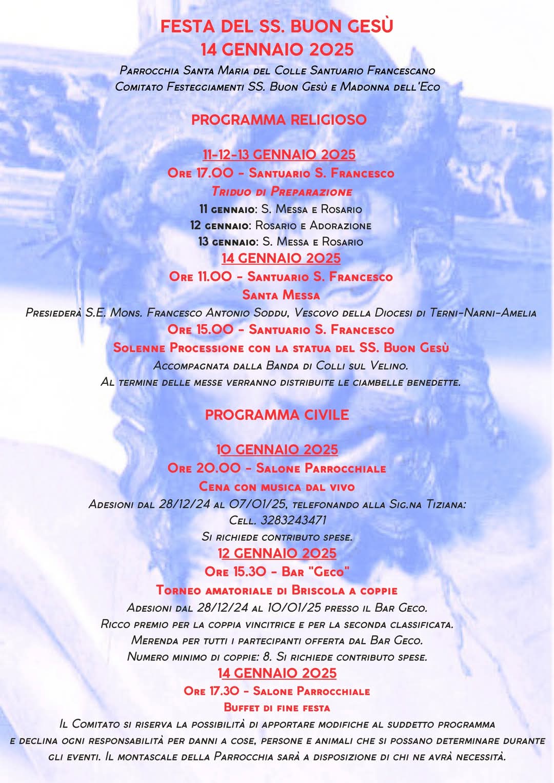 La parrocchia Santa Maria del Colle di Piediluco celebra la festa del Buon Gesù, patrono del borgo lacuste, martedì 14 gennaio alle ore 11 con la messa solenne presieduta dal vescovo Francesco Antonio Soddu nel santuario di San Francesco a Piediluco, dove è custodito il crocifisso del Buon Gesù, concelebrata dal parroco don Lorenzo Spezia e animata dalla corale parrocchiale.