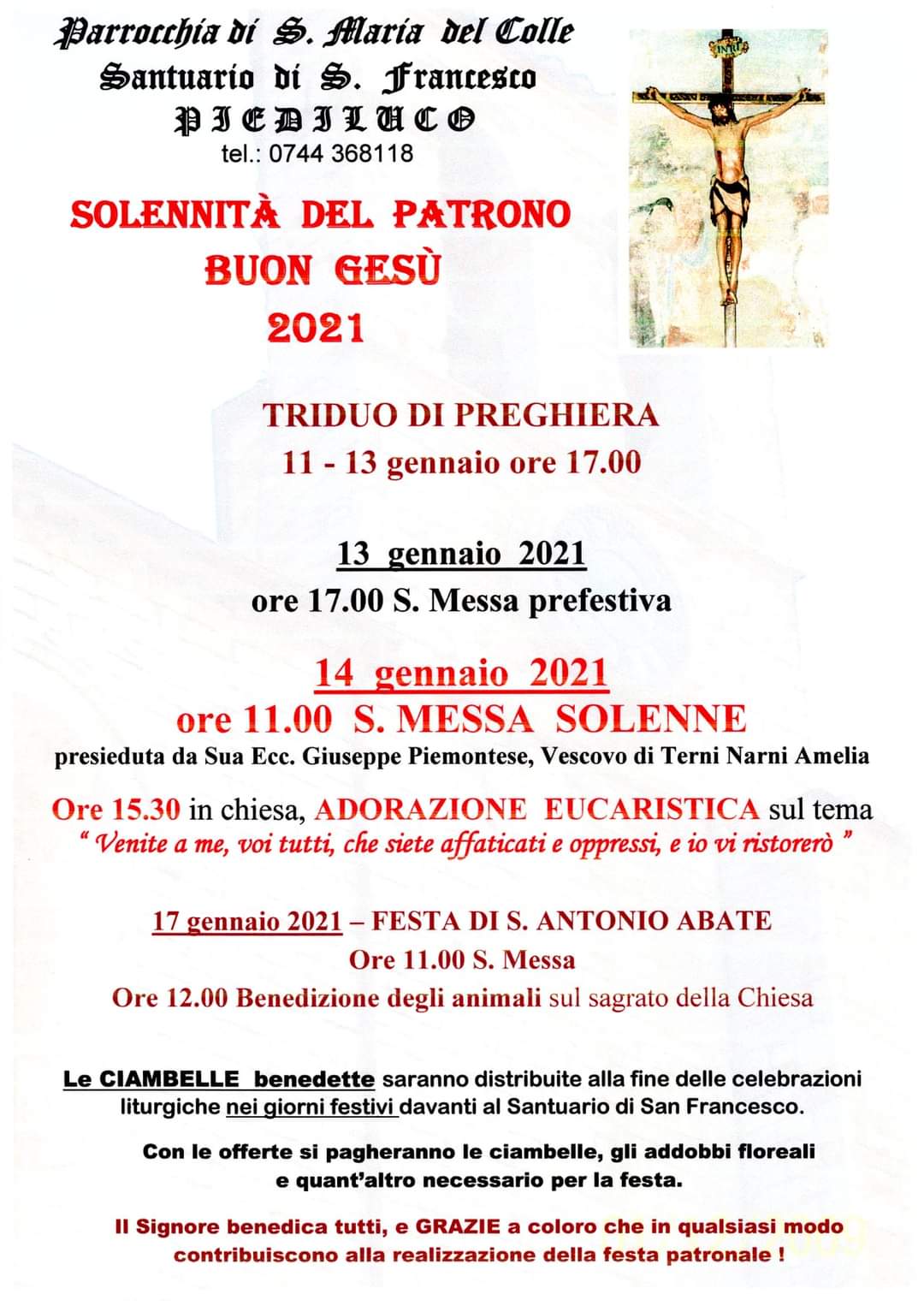 La parrocchia Santa Maria del Colle di Piediluco celebra la festa del Buon Gesù, patrono del borgo lacuste, il 14 gennaio alle ore 11 con la messa solenne presieduta dal vescovo Giuseppe Piemontese nel santuario di San Francesco a Piediluco, dove è custodito il crocifisso del Buon Gesù. Alle ore 15.30 in chiesa l’adorazione eucaristica “Venite a me, voi tutti che siete affaticati e oppressi, e io vi ristorerò”.