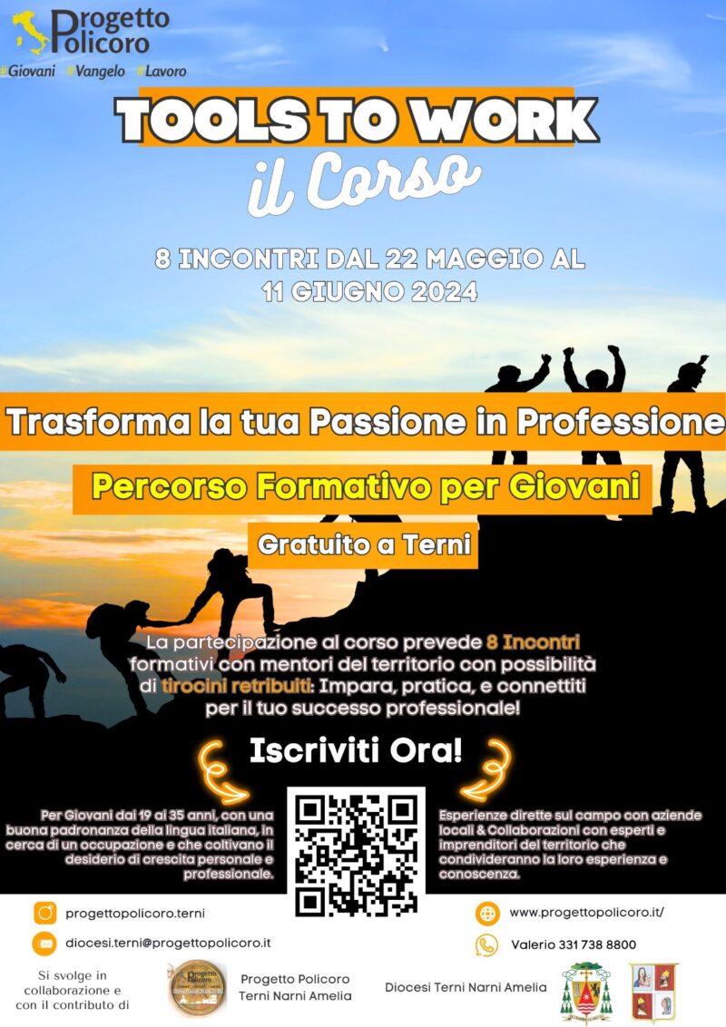 Il Progetto Policoro della diocesi di Terni-Narni-Amelia propone un corso di formazione “Tools to Work” che offre 8 moduli formativi sia teorici che pratici, dal 22 maggio all’11 giugno alle ore 17, completamente gratuito, presso i locali adiacenti la chiesa di Sant’Alò a Terni, con possibilità di tirocini retribuiti con aziende locali, per mettere subito in pratica ciò che impari. Percorsi e testimonianze di esperti e imprenditori del territorio che condivideranno la loro esperienza e conoscenza.