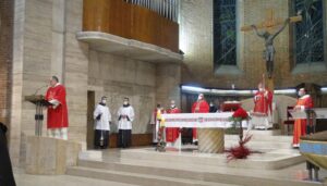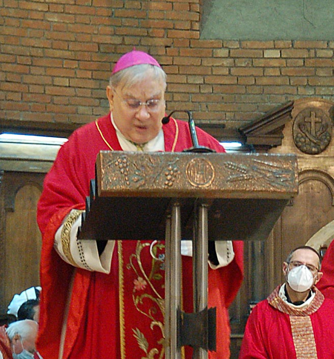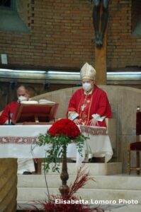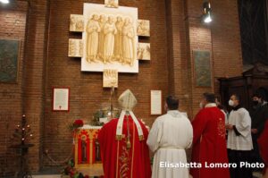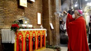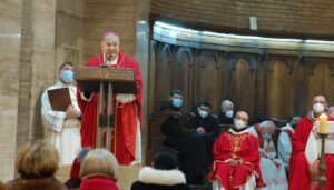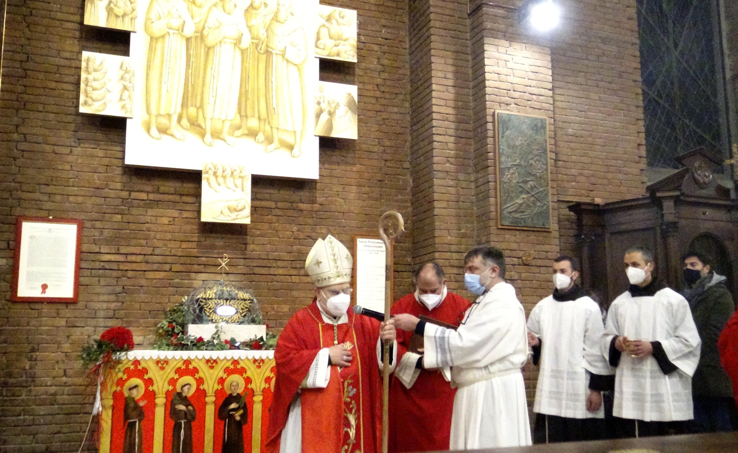 “Non possiamo archiviare il racconto dei Protomartiri francescani – ha detto il vescovo nell’omelia -. Essi hanno saputo manifestare il loro amore per Gesù e per i fratelli fino a donare la vita. Hanno “rappresentato” l’Agnello immolato per la salvezza del mondo. Altre sono le sensibilità dei nostri giorni, ma uguale è la necessità di seguire oggi le orme dell’Agnello di Dio, che porta il peso, il peccato del mondo. Con Gesù, Agnello che si fa pane, nutrimento del corpo e dello spirito, anche in questo tempo di pandemia, pieni di ardore e di amore amiamo questo mondo portando e donando il pane della Parola, il pane eucaristico, il pane della carità, quello quotidiano, il conforto e la speranza. La dimensione martirale è carisma della nostra Chiesa diocesana: quello del sangue, con Valentino, Giovenale, Fermina, i Protomartiri; quello della testimonianza quotidiana della sofferenza, con i tanti santi vescovi, sacerdoti, religiosi e laici: sant’Anastasio, san Cassio, il beato Antonio Vici, la beata Lucia Broccadelli, la beata Lucia Bufalari, la serva di Dio Madre Maria Eletta di Gesù, e più recentemente il servo di Dio mons. Loiali e qui a Terni il venerabile Giunio Tinarelli, di cui domani ricordiamo il 65° anniversario del transito (14 gennaio 1956), esempio di martirio prolungato, oltre 20 anni, vero agnello che ha portato speranza nel nostro mondo”.
