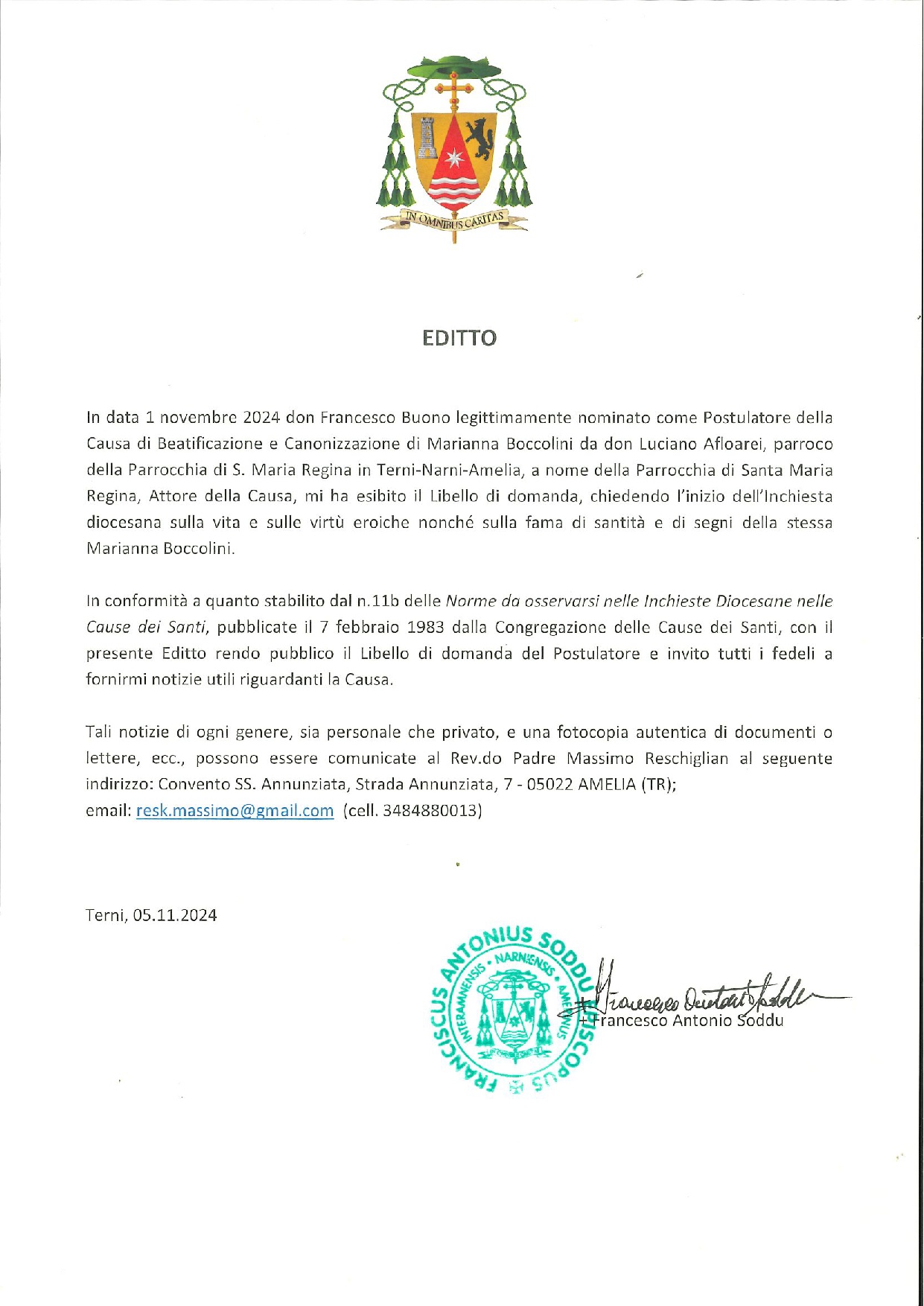 Editto per l’avvio dell’iter dell’Inchiesta diocesana sulla vita e sulle virtù eroiche nonché sulla fama di santità di Marianna Boccolini