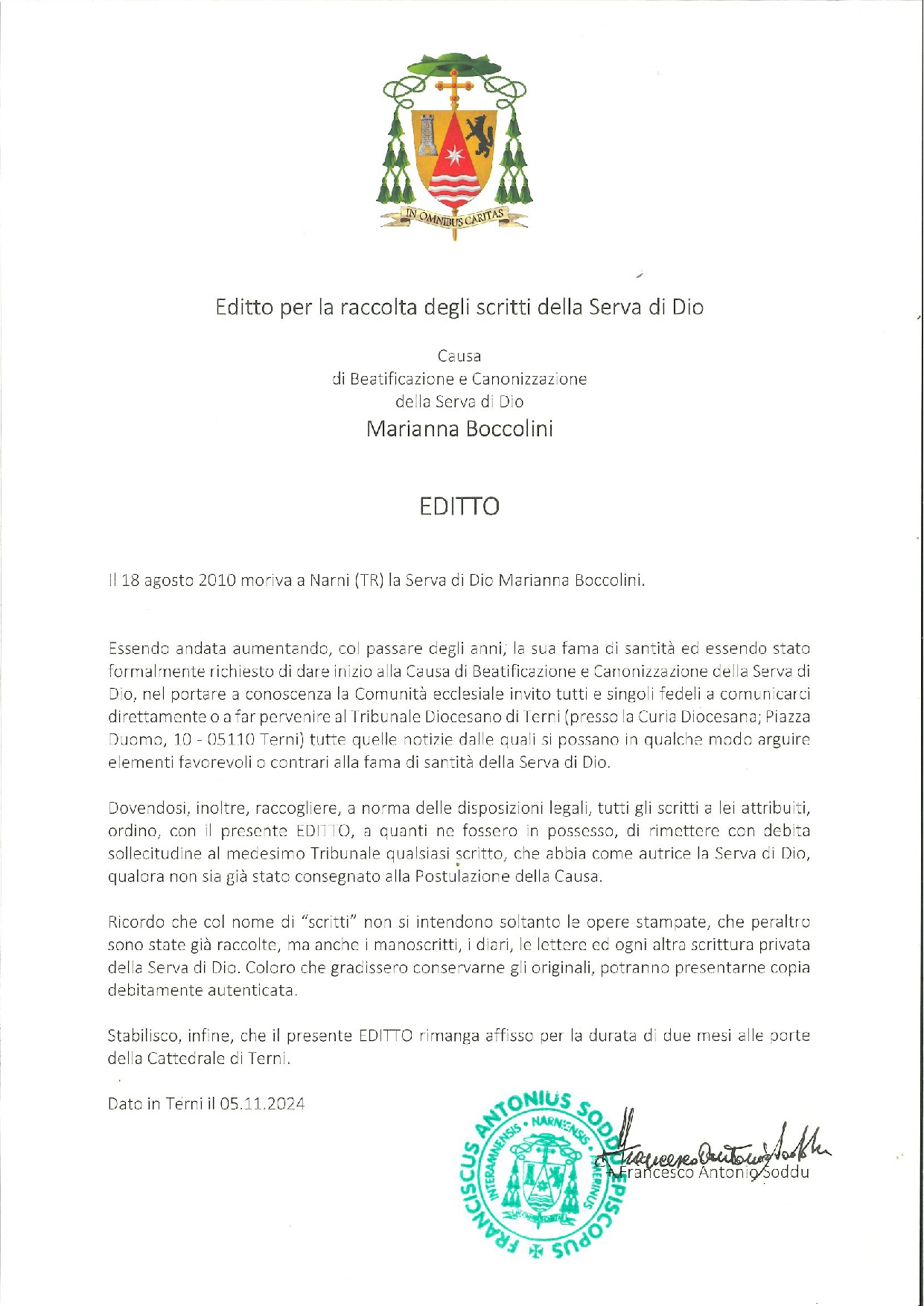 Dovendosi, inoltre, raccogliere, a norma delle disposizioni legali, tutti gli scritti a lei attribuiti, il Vescovo ordina, con il seguente Editto, a quanti ne fossero in possesso, di rimettere con debita sollecitudine al Tribunale Diocesano di Terni (presso la Curia Diocesana; Piazza Duomo, 10 – 05110 Terni) qualsiasi scritto, che abbia come autrice la Serva di Dio, qualora non sia già stato consegnato alla Postulazione della Causa.
