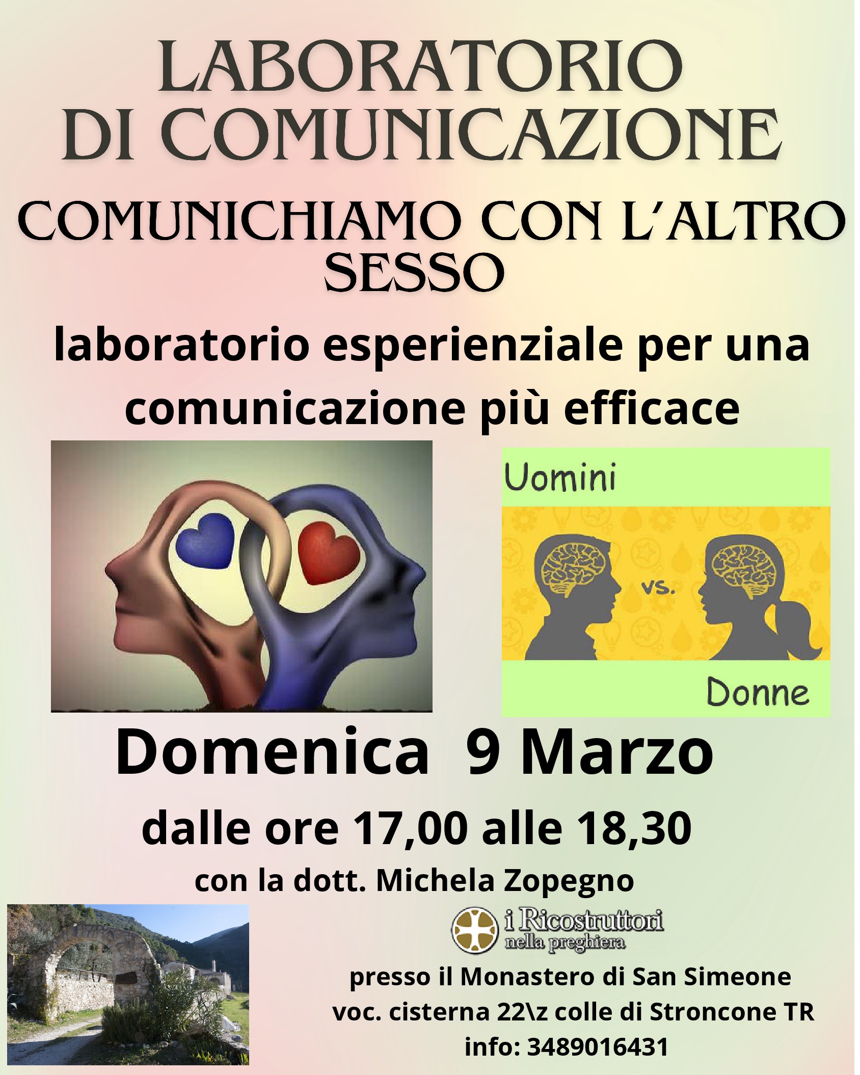 Domenica 9 marzo dalle ore 17,00 alle 18,30 con la dott. Michela Zopegno laboratorio di comunicazione “Comunichiamo con l’altro sesso” esperienziale per una comunicazione più efficace, presso il Monastero di San Simeone voc. cisterna 22\z colle di Stroncone TR info: 3489016431