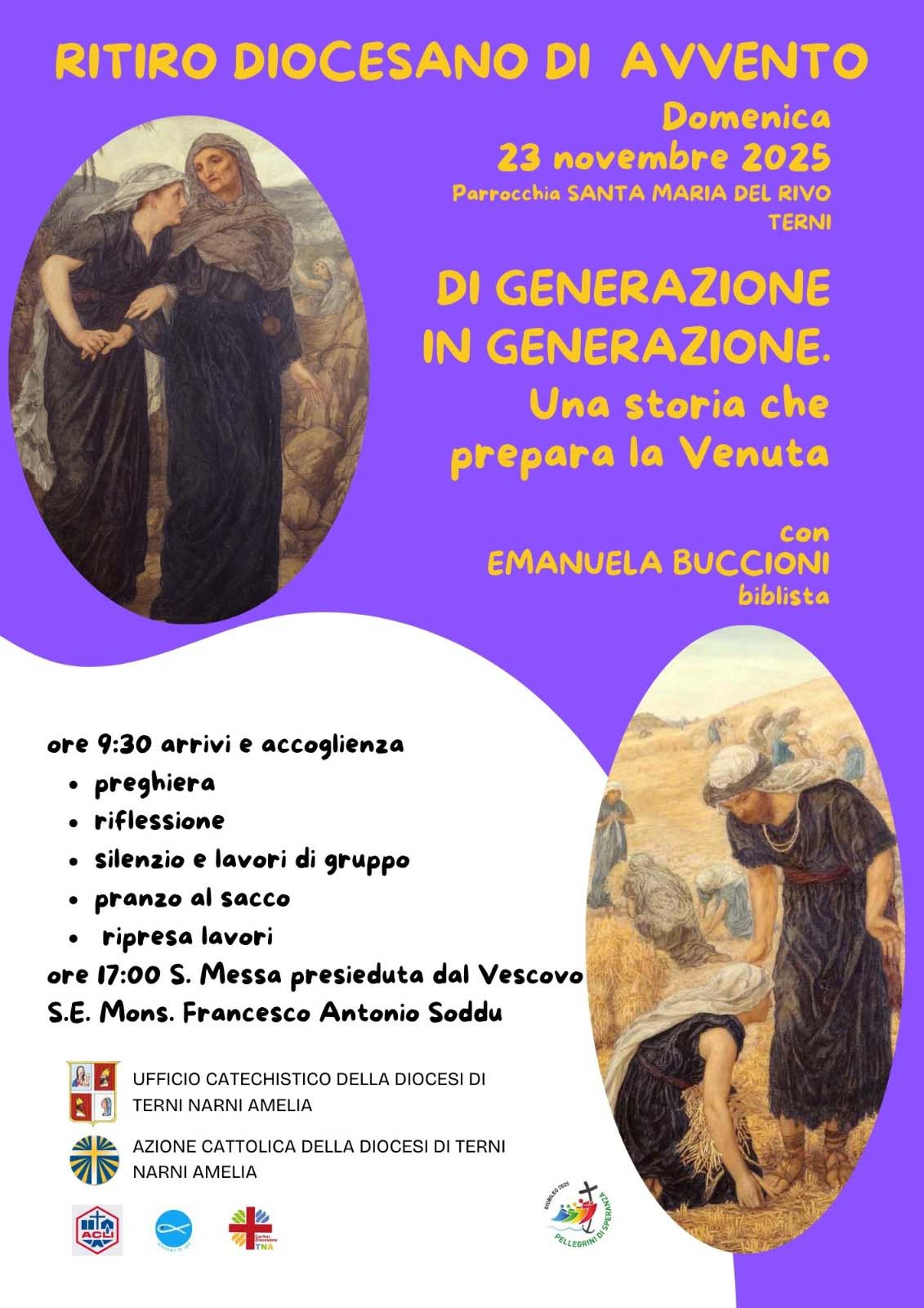 Domenica 23 novembre presso la parrocchia di Santa Maria del Rivo a Terni si è tenuto il ritiro diocesano in preparazione all’Avvento e al Natale, dei catechisti, operatori Caritas parrocchiali e Azione Cattolica. La riflessione “Di generazione in generazione, una storia che prepara la Venuta” sul libro di Rut è stato guidato dalla biblista Emanuela Buccioni, responsabile del Settore dell’apostolato biblico della diocesi di Terni-Narni-Amelia.